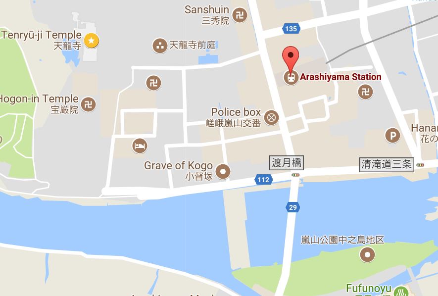 1. (เส้นสีเขียว) นั่งรถไฟกลับไปสถานี JR Kyoto แล้ว ใช้รถไฟไปลงสถานี Saga-Aeashiyama2. (เส้นสีแดง) นั่งรถไฟขึ้นไปอีกป้าย ไปลงสถานี SHIJO แล้วเปลี่ยนไปเป็นรถไฟของ Hankyu สถานี KARASUMA อยู่ที่เดียวกับสถานีรถไฟ SHIJJO แต่เนื่องจากเป็นรถไฟคนละบริษัท จึงต้องออกจากสถานี SHIJO แล้วเข้าไปสถานี KARASUMA อีกที หรือ ถ้าที่พักอยู่ไม่ไกลก็เดินไปสถานี KARASUMA ก็ได้ แล้วใช้รถไฟ HANKYU ไปลงสถานี KATSURA แล้วเปลี่ยนไปใช้สาย ARASHIYAMA เพื่อไปลงสุดสายที่สถานี HANKYU-ARASHIYAMA อีกที (สถานีนี้อยู่อีกฝั่งของแม่น้ำ)