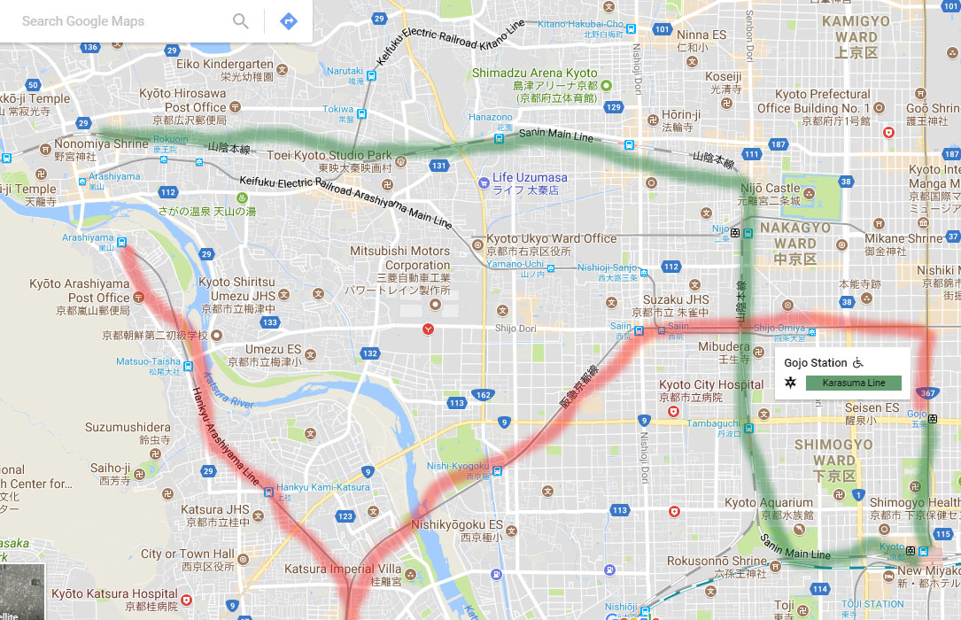 2. (เส้นสีแดง) นั่งรถไฟขึ้นไปอีกป้าย ไปลงสถานี SHIJO แล้วเปลี่ยนไปเป็นรถไฟของ Hankyu สถานี KARASUMA อยู่ที่เดียวกับสถานีรถไฟ SHIJJO แต่เนื่องจากเป็นรถไฟคนละบริษัท จึงต้องออกจากสถานี SHIJO แล้วเข้าไปสถานี KARASUMA อีกที หรือ ถ้าที่พักอยู่ไม่ไกลก็เดินไปสถานี KARASUMA ก็ได้ แล้วใช้รถไฟ HANKYU ไปลงสถานี KATSURA แล้วเปลี่ยนไปใช้สาย ARASHIYAMA เพื่อไปลงสุดสายที่สถานี HANKYU-ARASHIYAMA อีกที (สถานีนี้อยู่อีกฝั่งของแม่น้ำ)