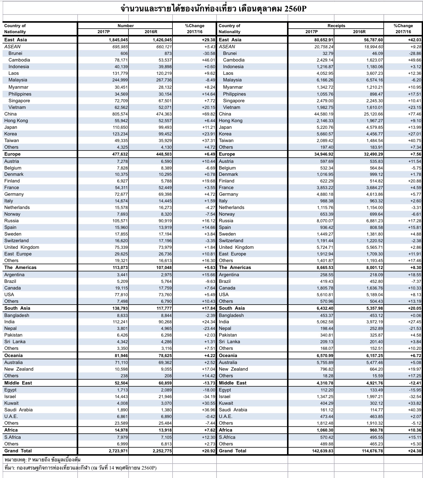 นักท่องเที่ยวชาวต่างชาติที่เดินทางเข้าประเทศไทย เมษา 2017 เพิ่มขึ้น 7.64% yoy อเมริกา +28% ยุโรป +16%!!