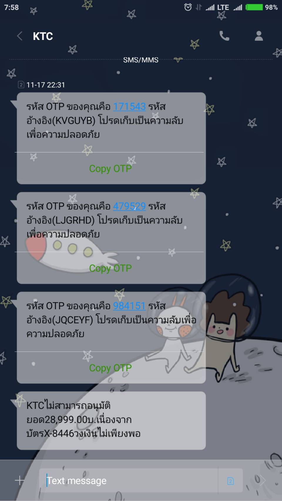 ซึ่งก็น่าจะแปลได้ว่ามีปัญหาในการด้วยการ ผ่อนชำระ และยังคงอยู่ในหน้าการทำรายการ ผมมั่นใจว่าบัตรมีวงเงินเหลือมากพอ และไม่น่ามีปัญหาจึงทำรายการซ้ำในหน้านั้นต่อไป แต่ระบบก็ยังคงแสดง Error เช่นเดิม จนได้รับ SMS แจ้งจากทางบัตรว่าวงเงินเต็ม จึงโทรไปสอบถามกับทางบัตร ได้รับการแจ้งว่ามีการตัดวงเงินไปแล้วสองครั้ง ซึ่งในขณะนั้น การทำรายการผมยังไม่สำเร็จเลย ยังคงอยู่ที่หน้า Error ดังกล่าว