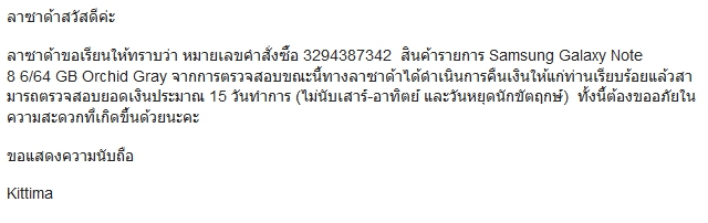 เนื่องจากขณะทำรายการเป็นช่วงเวลากลางคืนแล้ว จึงต้องรอตอนเช้าถึงติดต่อเจ้าหน้าที่ได้ ซึ่งกว่าจะคุยกันรุ้เรื่องใช้เวลานานมาก และพูดจาวกวนมากๆ ผมได้แจ้งความจำนงไปว่า ไม่เป็นไร ที่ตัดเกินไปก็คืนมา ส่วนที่สั่งก็ให้จัดส่งมาตามปกติ สุดท้ายเหมือนจะจบได้ด้วยดี เมื่อเจ้าหน้าที่รับเรื่องประสานงาน และได้รับเมล์ในวันที่ 20 จากทาง Lazada ว่าจะทำการคืนยอดเงินดังกล่าวให้
