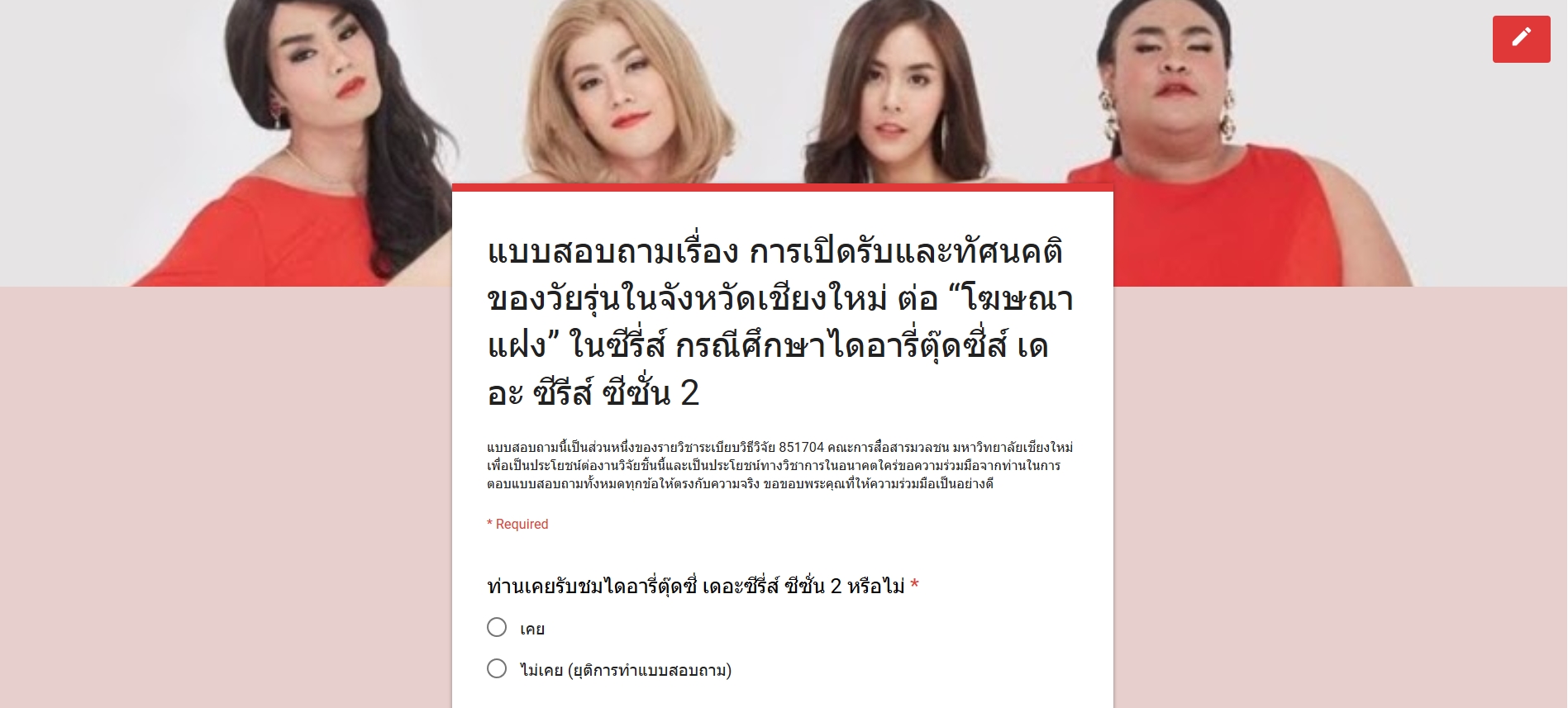 คนเชียงใหม่ อายุ 15-25 ปี รบกวนทำแบบสอบถามเกี่ยวกับ “โฆษณาแฝง” ในซีรี่ส์ไดอารี่ตุ๊ดซี่ส์ ซีซั่น 2 ให้หน่อยนะคะ