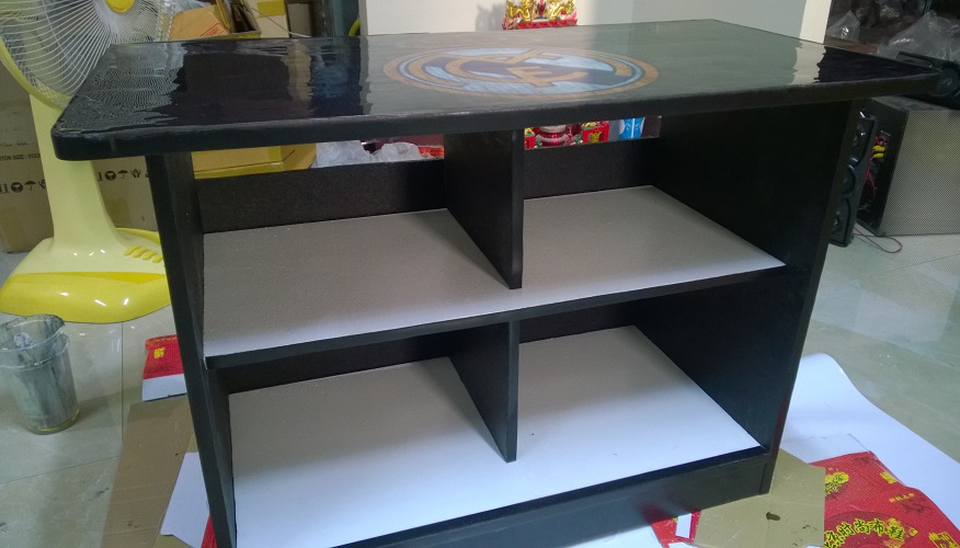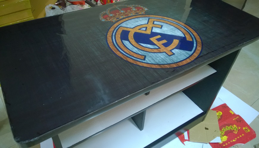 ทีนี้ .. ตู้ใบนี้เป็นของลูกชาย เลยให้เขาเลือกลายหน้า TOP ผมเลยสั่งพิมพ์สติ๊กเกอร์ขนาดหน้าโต๊ะ ในราคาประมาณ 250 บาท (แพงไปนิดนึง) แล้วปิดบนหน้า TOP แต่เพิ่มความสวยงาม แข็งแรงด้วย เรซิ่นแบบใส เอามาเคลือบหน้าโต๊ะครับ จะเห็นได้ถึงความเงา จนเสร็จก้อเก็บรายละเอียดครับ