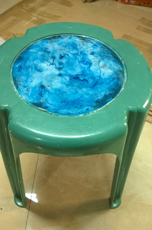 แถมครับ เรซิ่นเหลืออยู่บ้าง เลยจับเอาเก้าอี้พลาสติกที่พื้น แตกหัก เอามาเทด้วยเรซิ่น เพิ่มความแข็งแรง และสวยงาม ครับ