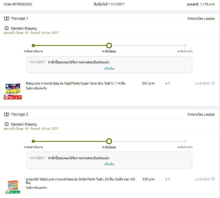 คือผมได้สั่งซื้อกางเกงผ้าอ้อมไปกับ Lazada หมายเลขสั่งซื้อ 3798563542 โดยระบบแจ้งว่าของจะถึงอย่างช้าไม่เกินวันที่ 18 พ.ย.60 แต่ปัจจุบันยังไม่ได้รับสินค้า และติดตามไม่ได้ว่าของอยู่ที่ไหน