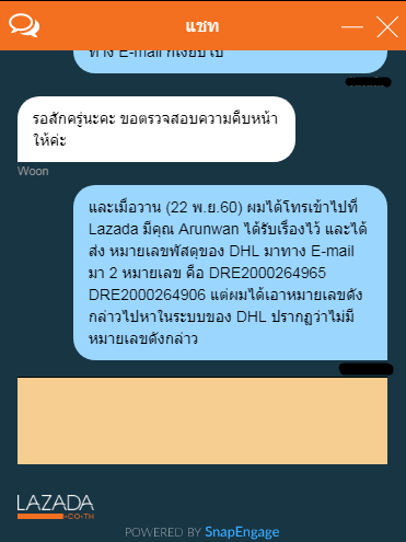 และเมื่อวาน (22 พ.ย.60) ผมได้โทรเข้าไปที่ Lazada มีคุณ Arunwan ได้รับเรื่องไว้ และได้ส่ง หมายเลขพัสดุของ DHL มาทาง E-mail มา 2 หมายเลข คือ DRE2000264965 DRE2000264906 แต่ผมได้เอาหมายเลขดังกล่าวไปหาในระบบของ DHL ปรากฏว่าไม่มีหมายเลขดังกล่าว