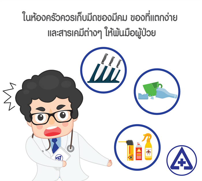 4. ถ้าจำเป็นอาจติดกุญแจล็อคเพื่อป้องกันไม่ให้ผู้ป่วยเข้าไปในครัว