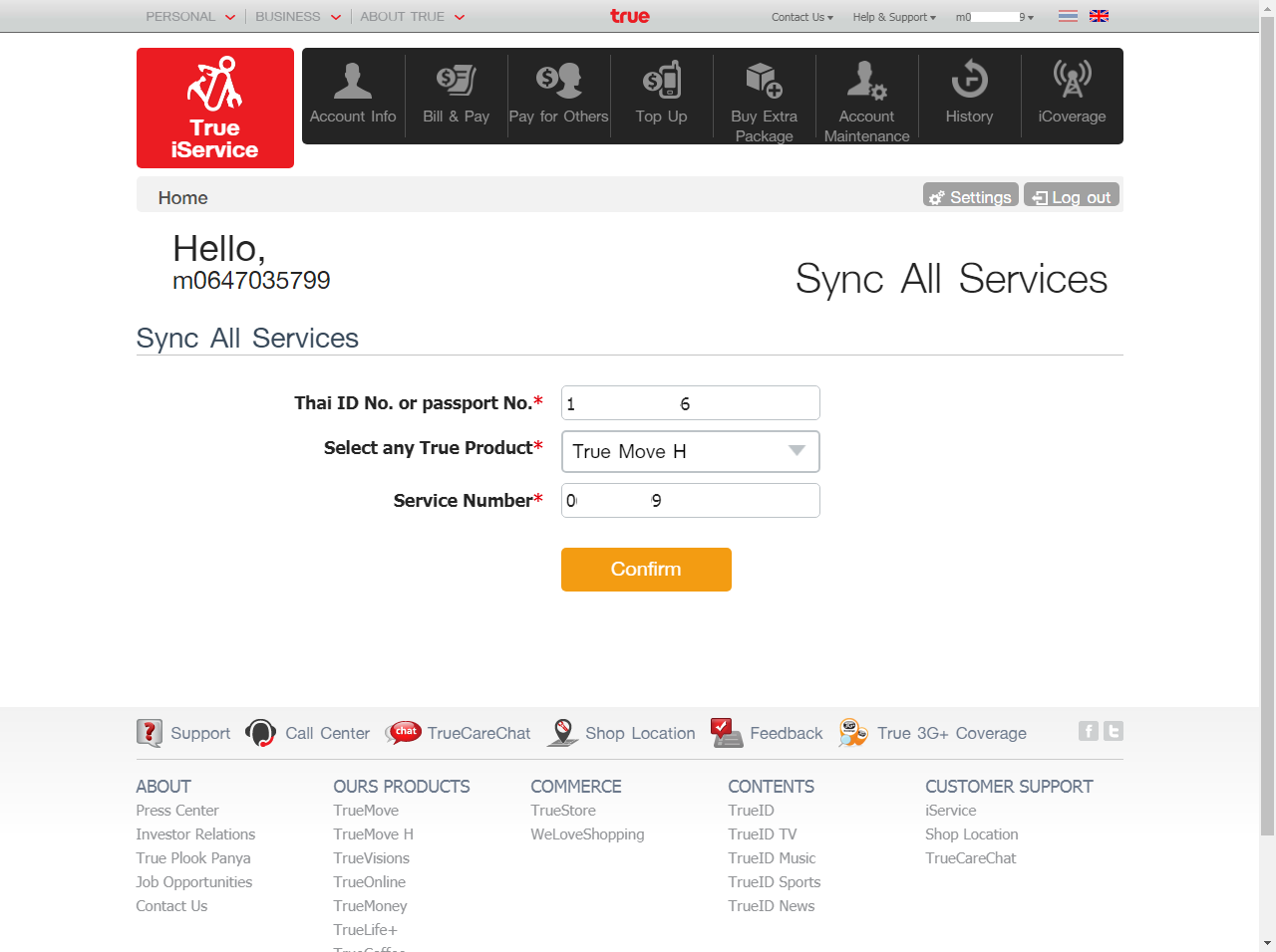 อันนี้คือหน้าแรกที่ผมเข้ามา สังเกตที่มุมขวาบนนะครับ ผมเข้าสู่ระบบแล้ว เจอหน้าเมนูพร้อมฟอร์มให้กรอกเลขบัตรประชาชน และเลขของบริการ ผมก็กรอกตามที่ระบบต้องการไปครับ (ขออนุญาตเซ็นเซอร์เลขบัตรประชาชนและหมายเลขโทรศัพท์ เพื่อป้องกันการถูกนำไปใช้ในเรื่องเสียๆ หายๆ)