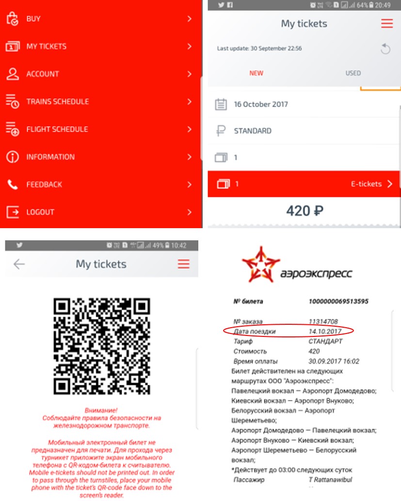 https://aeroexpress.ru/en/ ซึ่งราคาจะถูกกว่าซื้อหน้าเคาน์เตอร์ จาก 500 RUB เหลือ 420 RUB ราคานี้คือราคาต่อเที่ยวของ Standard Ticket (ไม่ว่าจะลงสนามบินไหนก็ราคาเท่ากัน) ตอนเข้าระบบไปทำรายการต้องลงทะเบียนก่อน ซึ่ง User ที่ใช้ลงทะเบียนนี้ ก็เอาไปเข้า Mobile Application ที่โหลดมาได้เลย มันลิงก์กัน แล้วข้อมูลตั๋วจะแสดงที่ My Tickets พอเปิดขึ้นมาจะเป็น QR Code ใช้สแกนเข้าสถานีรถไฟได้เลย ตั๋วไหนที่ใช้งานแล้วก็จะหายไปอยู่ในแถบ Used แต่สำหรับคนที่ไม่อยากโหลดแอพ หรือเมมมอรี่มือถือจะเต็ม ขอโหลดแอพที่จำเป็นพอ ก็สามารถพริ้นท์ตั๋วที่ส่งมาทางอีเมลล์ ซึ่งเป็น QR Code ใช้สแกนเข้าสถานีรถไฟได้เช่นกัน การซื้อตั๋วล่วงหน้าแบบนี้คุณจะไม่ต้องไปต่อคิวซื้อตั๋วที่เคาน์เตอร์หรือเครื่องซื้อตั๋วอัตโนมัติ ตรงดิ่งเข้าสถานีไปได้เลย แต่คุณต้องมีแผนการเดินทางที่แน่นอน เนื่องจากตั๋วใช้ได้ตามวันที่ระบุไว้เท่านั้น