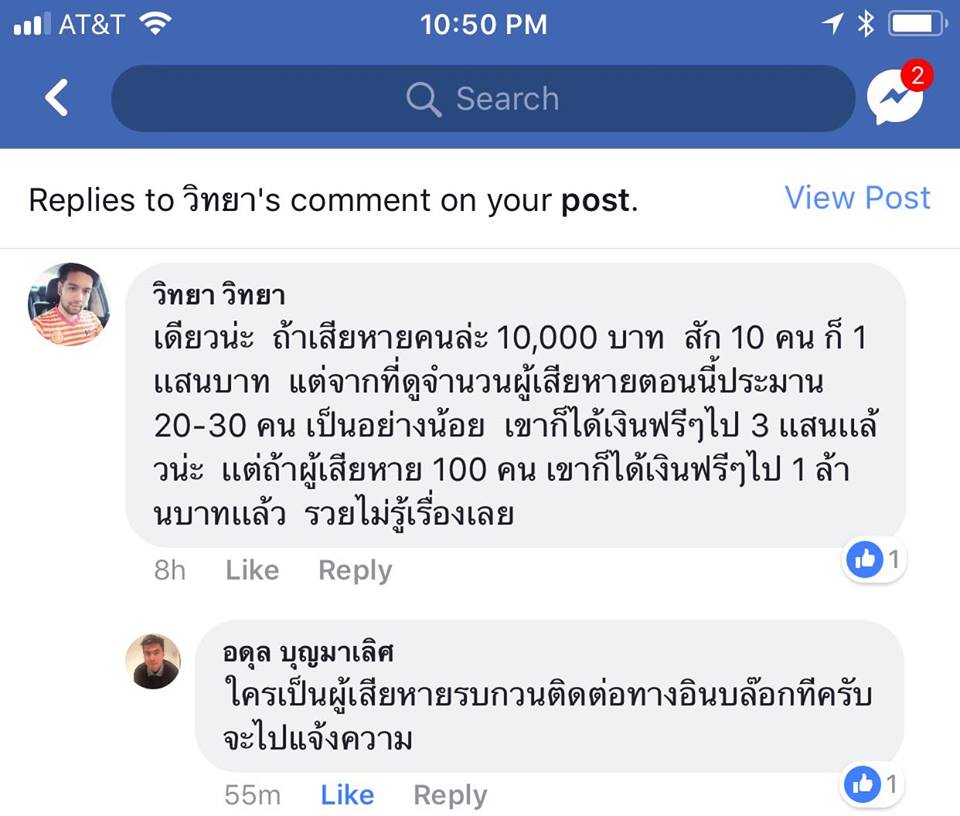 ขอเตือนพวกเหยื่อ love แสกมเมอร์หน่อย การที่มีคนหล่อ รวย ขุดเจาะน้ำมันมาจีบ จะมาให้ตัง ต้องประมาณตัวเองด้วย ว่ามีดีขนาด คนระดับนั้นจะมาจีบเลยหรอ สุดท้าย มามุกเดิม ต้องโอนเงินให้เขาก่อน เขาถึงโอนมาให