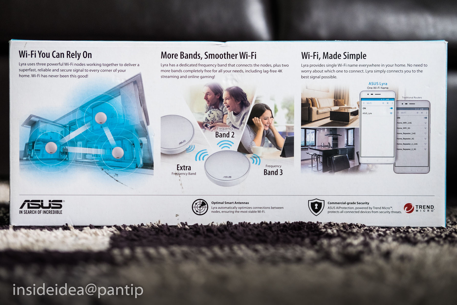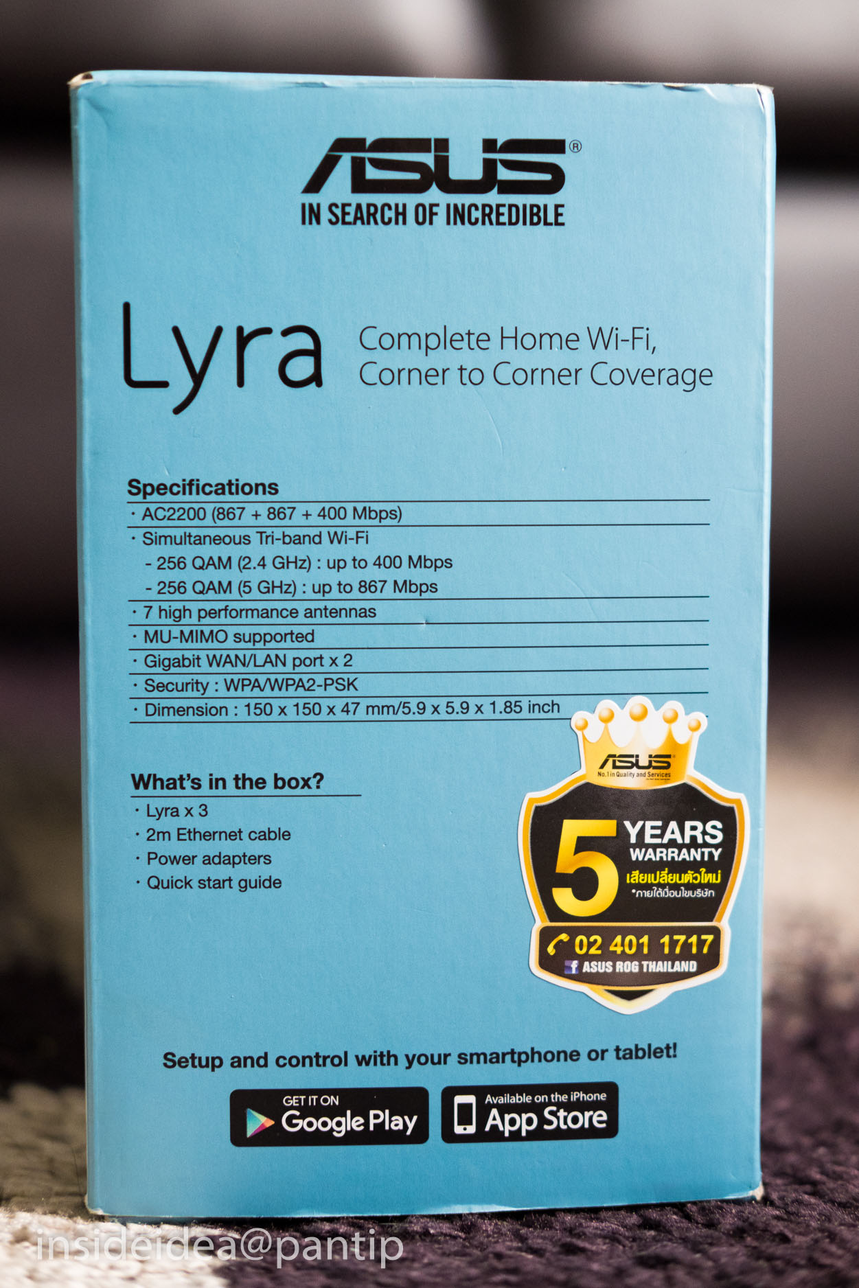 สเปคของ Lyra นั้นรองรับการเชื่อมต่อ Wi-Fi AC2200 (400+867+867 Mbps) บนมาตรฐาน a, b, g, n และ ac รองรับเทคโนโลยี MU-MIMO โดยทาง ASUS รับประกัน Lyra 5 ปีเต็ม