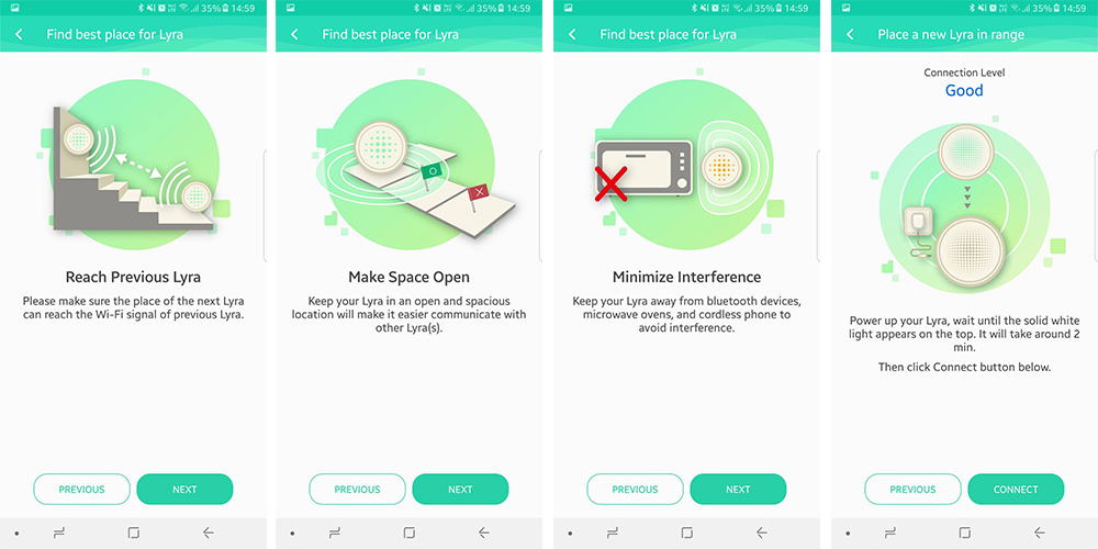 ส่วนการตั้งค่าตัวลูกอีกสองตัว รูปแบบจะเหมือนกันครับ แต่จะเพิ่มการแนะนำบริเวณจุดวาง Lyra เพื่อให้ได้ประสิทธิภาพที่ดีที่สุด แล้วก็ไม่ต้องมาตั้งชื่อ Wi-Fi อีก เพราะทุกตัวจะใช้เป็นชื่อเดียวกันกับตัว Lyra START นั่นเองครับ