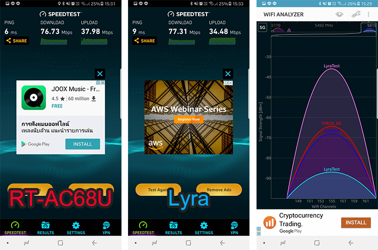 ทดสอบ ASUS Lyra(Wi-Fi ชื่อ LyraTest) vs RT-AC68U(Wi-Fi ชื่อ VIRUS)