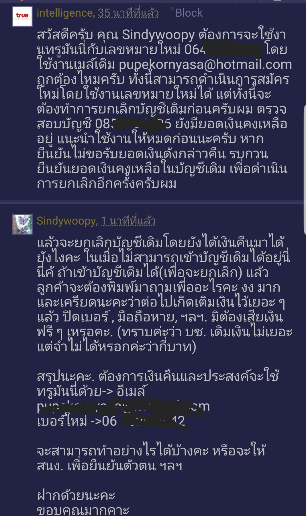 สวัสดีครับ คุณสมาชิก Sindywoopy ทางทีมงานได้เรียนแจ้งข้อมูลถอนเงินจากบัญชีทรูมันนี่ เพื่อยกเลิกบัญชีทรูมันนี่ รบกวนคุณสมาชิกยืนยันอีเมลล์ที่ต้องการส่งแบบคำร้องขอถอนเงินทางหลังไมค์อีกครั้งครับ