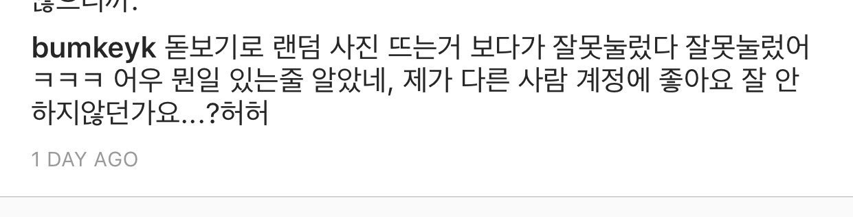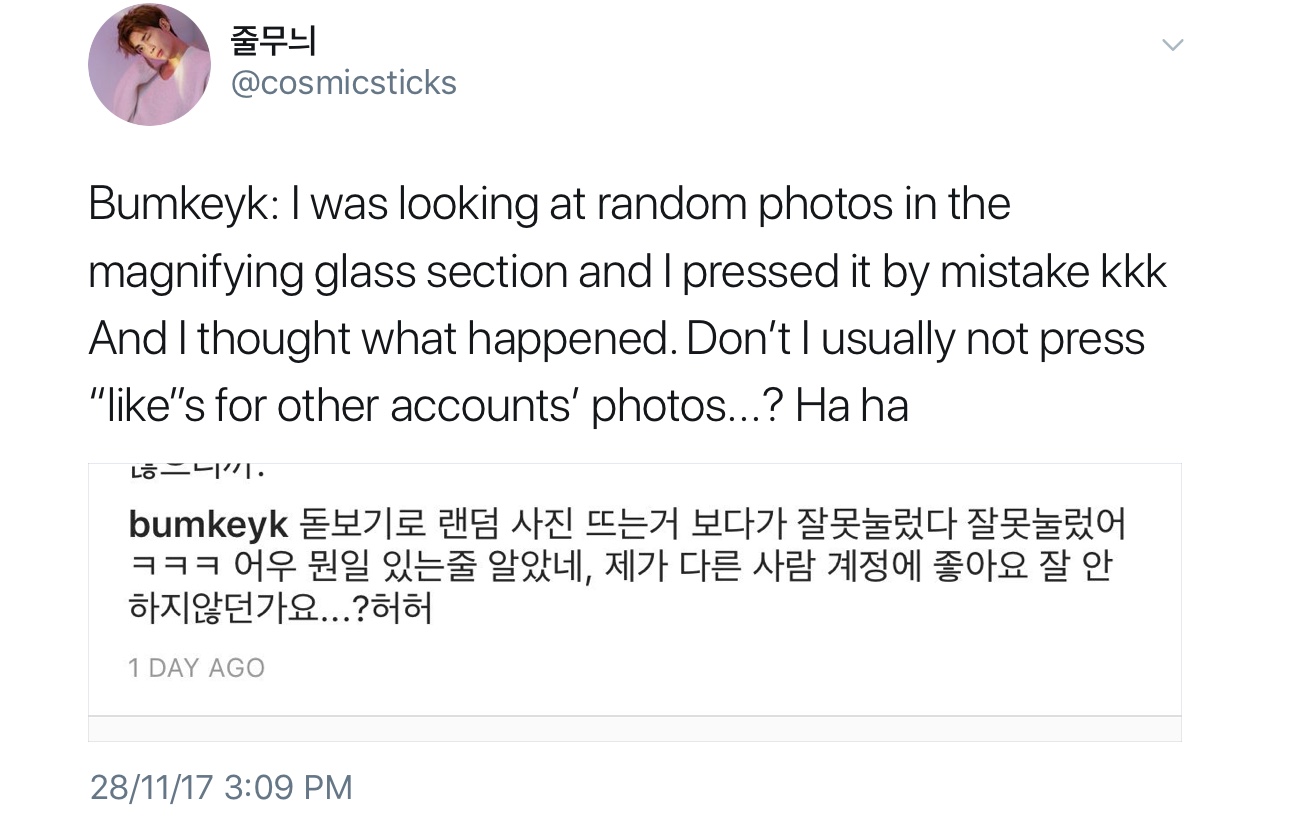 แปล: ผมกำลังดูรูปภาพแบบสุ่มในช่องค้นหา (ที่เป็นแว่นขยายในไอจี) แล้วผมเผลอกดไลค์ไป แล้วผมก็คิดว่าเกิดอะไรขึ้น.. ปกติผมก็ไม่เคยกดไลค์รูปใครแบบมั่วๆ แบบนี้นี่ครับ? ฮาฮา (eng trans: cosmicsticks) *แปลผิดพลาดขออภัย*