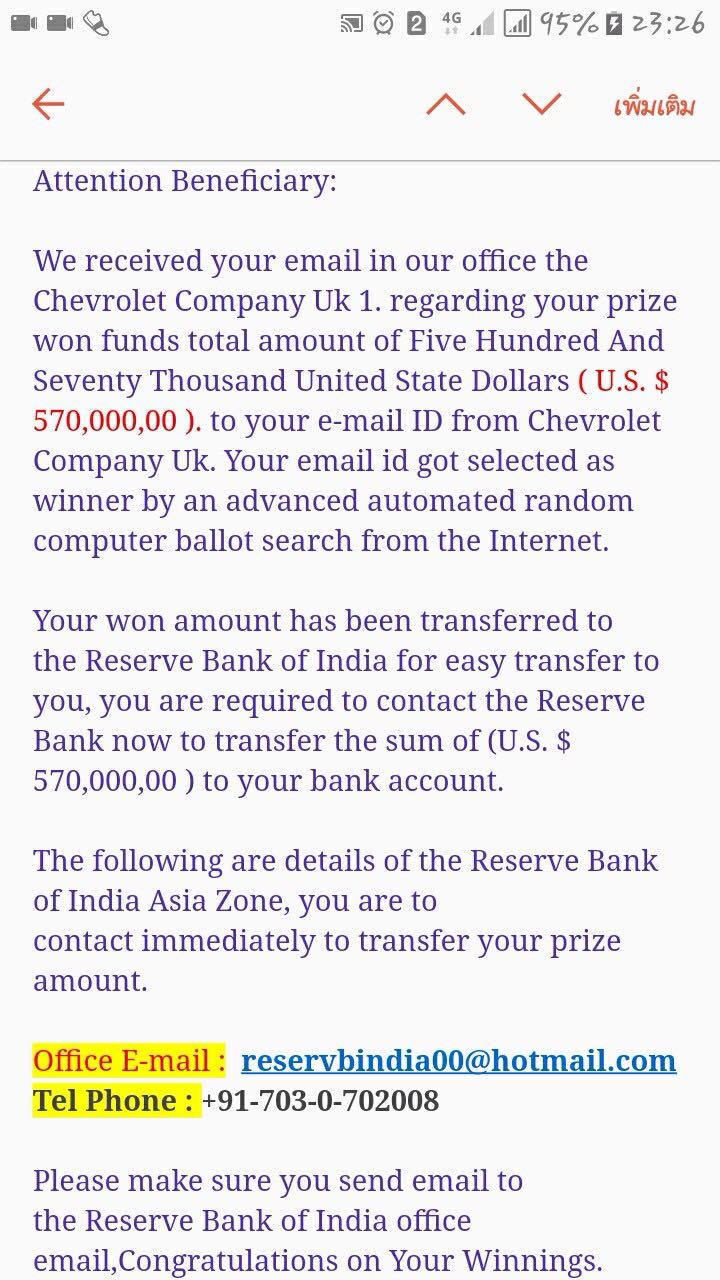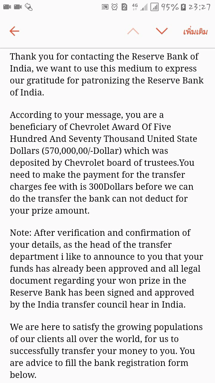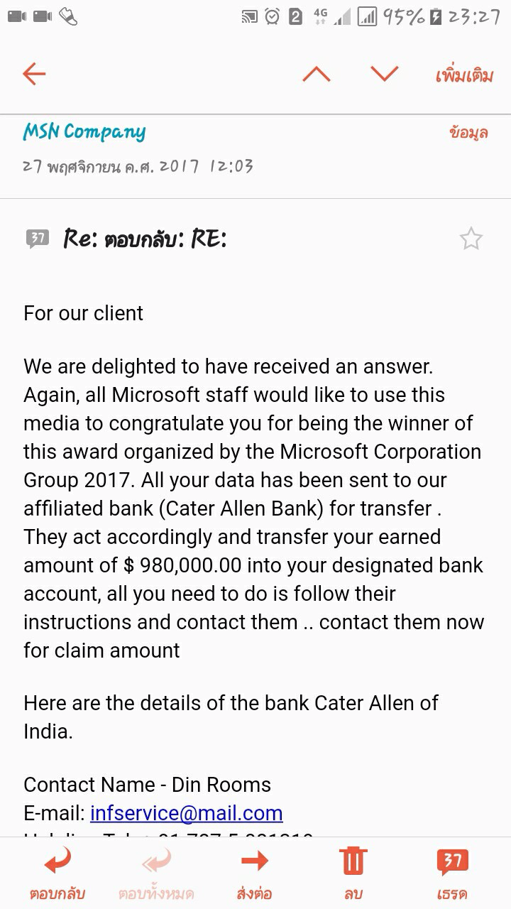 980,000$ บ้าไปแล้ว เป็นเงินไทยนี่ ห้าสิบกว่าล้าน ใครเคยเจอมาส่งเมล์แบบนี้บ้าง
