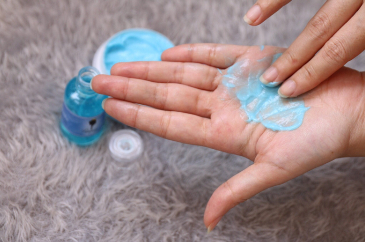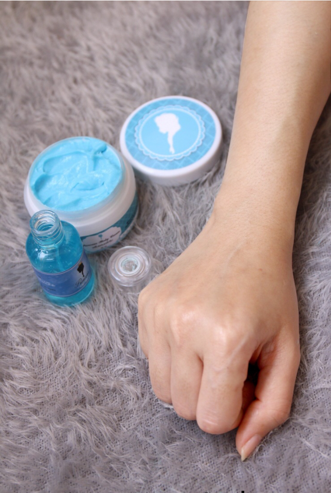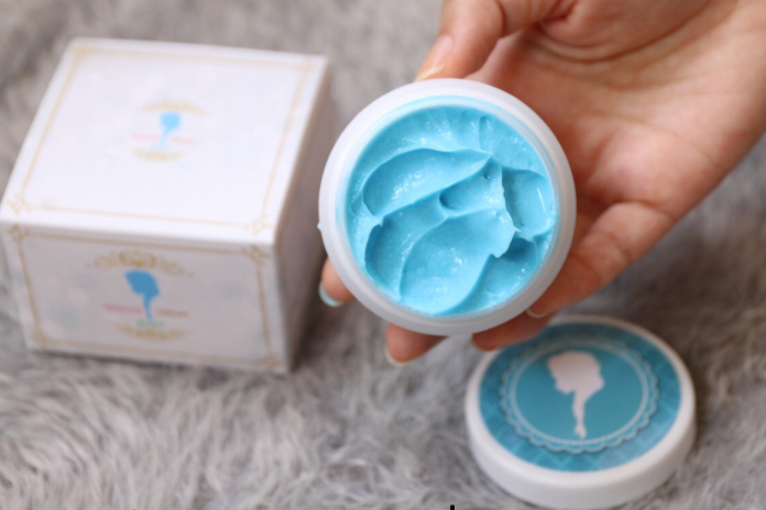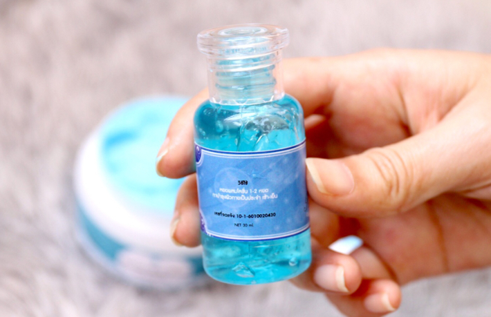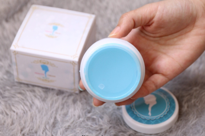 เนื้อครีมก็จะเป็นสีฟ้า มีกลิ่นหอมอ่อนๆ เกลี่ยง่ายและซึมค่อนข้างเร็ว