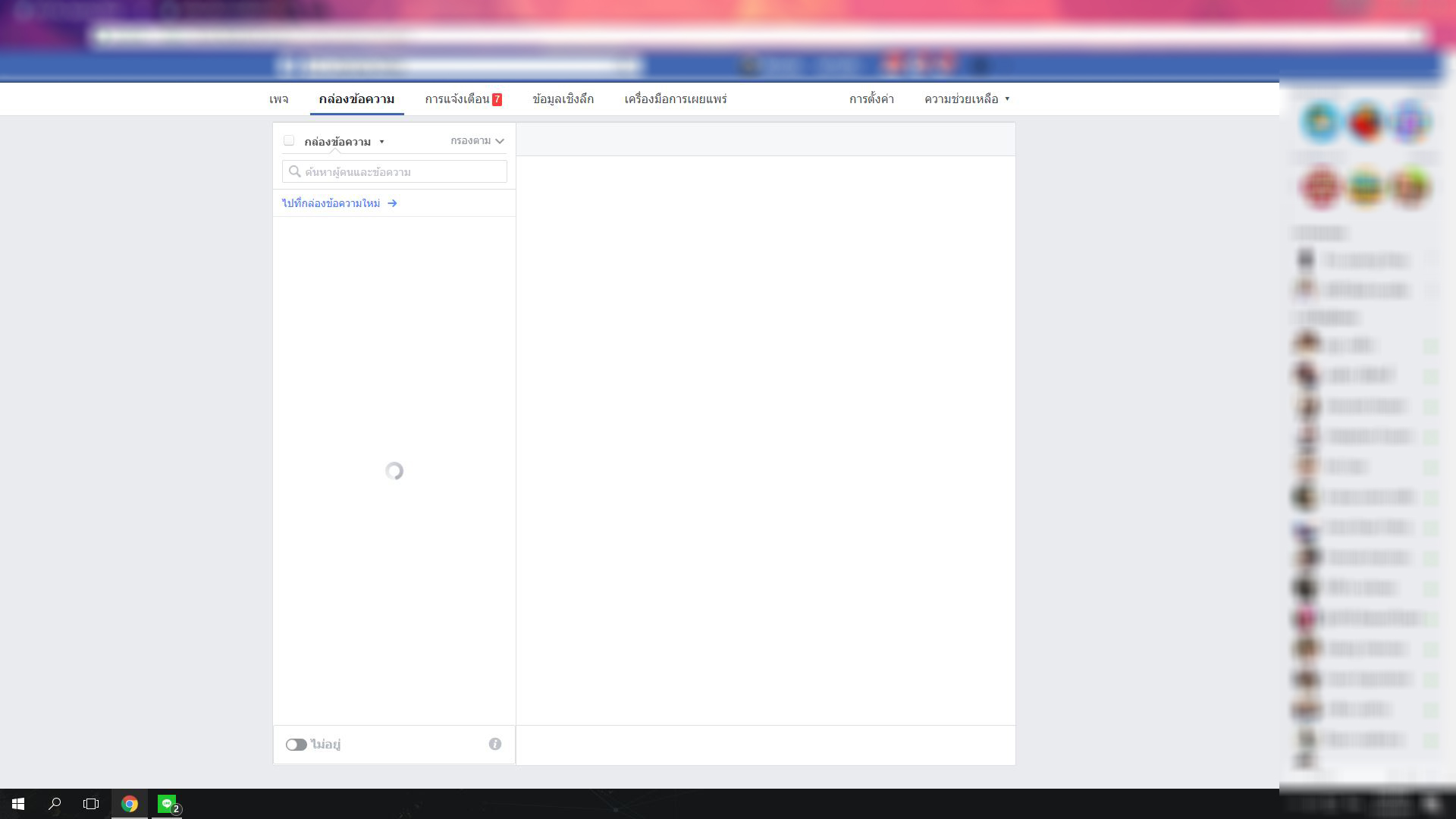 คือ ว่า อยู่ดีๆวันนี้ เปิดคอมมาแล้ว เปิดเพจตอบลูกค้า เข้าหน้ากล่องข้อความ เหมือนกำลังโหลด 1-2 วินาที(ภาพ 1) แล้วก็ หายไปเลยไม่มีอะไร (ภาพ 2 ) ตอบลูกค้าไม่ได้เลย ผมลองรีเซต ข้อมูลทุกอย่างใน Chome