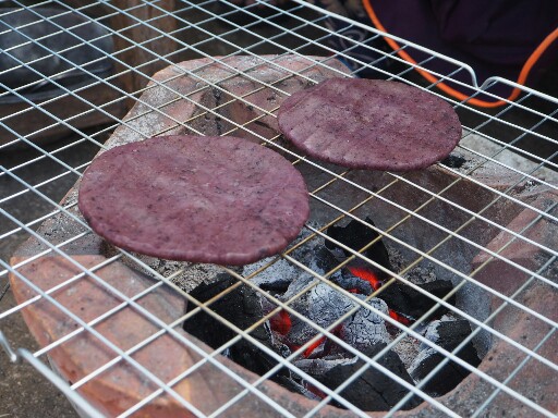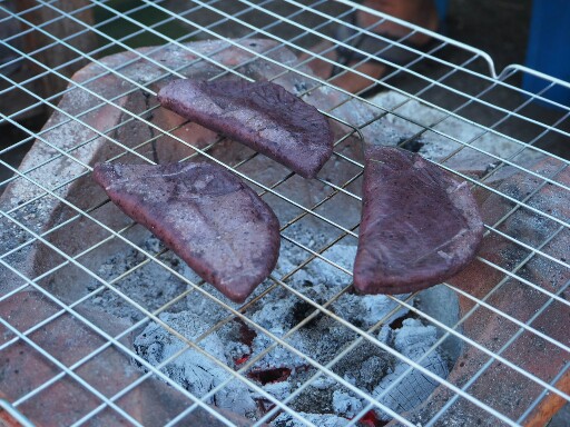 .จากนั้นนำน้ำอ้อยผสมงาดำหยอดลงไปในแผ่นข้าวดำที่วางบนเตา