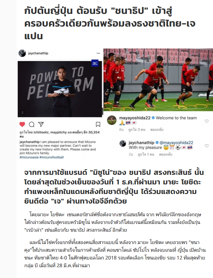 ชนาธิป สรงกระสินธ์ ดาวเด่นแห่งทีมฟุตบอลไทยและทีมฟุตบอลเจลีก ฮอกไกโด คอนซาโดเล่ ซัปโปโร ได้เซ็นสัญญาอย่างเป็นทางการกับบริษัทเสื้อผ้าและอุปกรณ์กีฬายักษ์ใหญ่ “มิซูโน่” โดยนักฟุตบอลยอดเยี่ยมแ