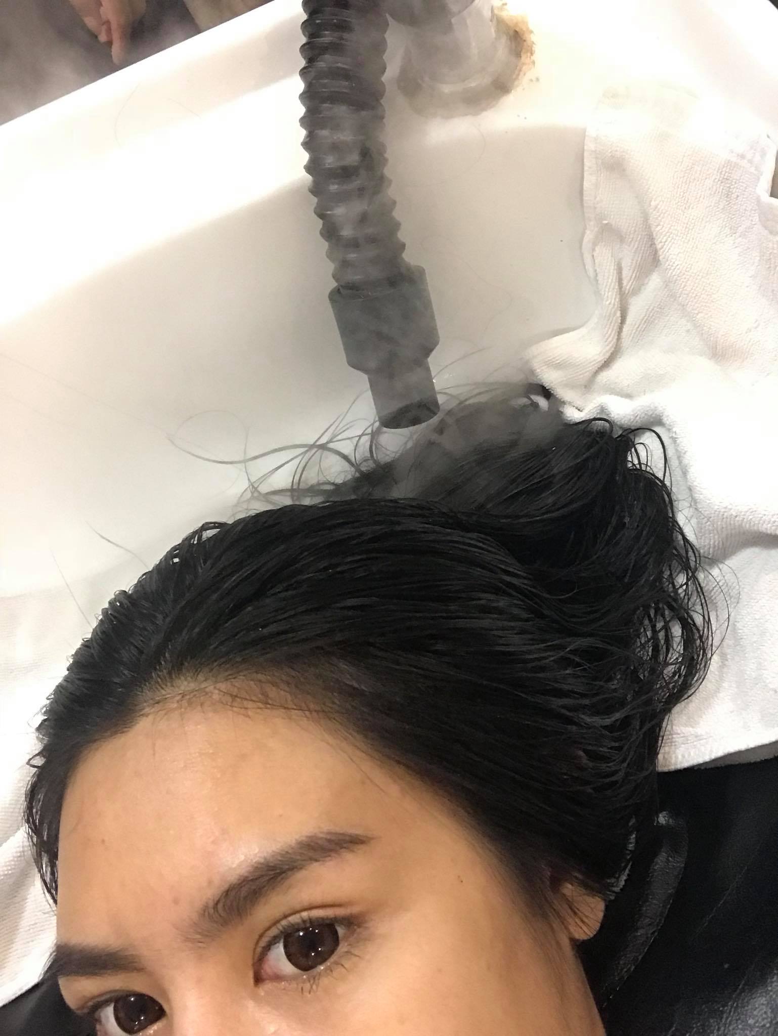 แล้วก็จะมีเครื่องพ่นไอน้ำมาพ่นให้คะ ทำให้ทรีทเม้นซึมลึกมากขึ้น
