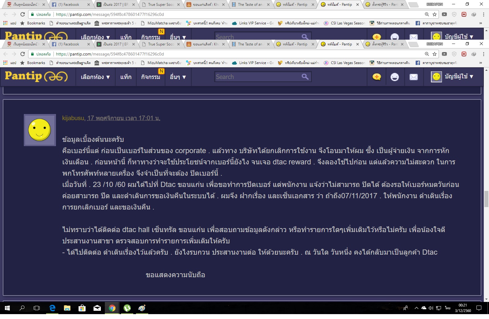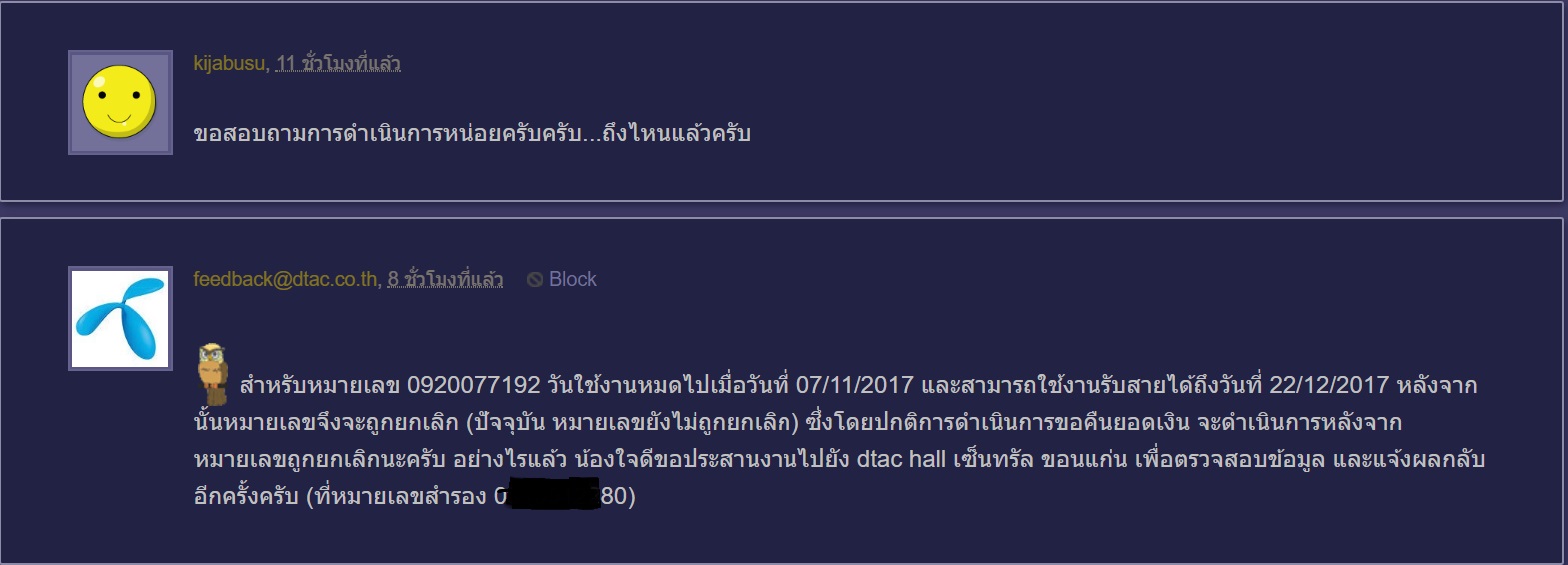 จึงได้ติดต่อที่ Dxxx เซ็นทรัล ขอนแก่น เมื่อวันที่ 23 /10 60 พนักงานแจ้งว่า ยังไม่สามารถยกเลิกเบอร์ได้ จนกว่าวันของเบอร์จะหมด ถึงมาสารถปิด หรือยกเลิกเบอร์ได้ (07/11/60)และก็แจ้งความจำนงต่อพนักงานว่า อย่างนั้นแล้ว เด๋วขอเซ็นเอกสารไว้ เมื่อถึงวัน รบกวนพนักงาน ดำเดินการบยกเลิกให้ พอวันที่ 17/11/60 inBox ไปสอบถาม