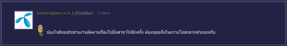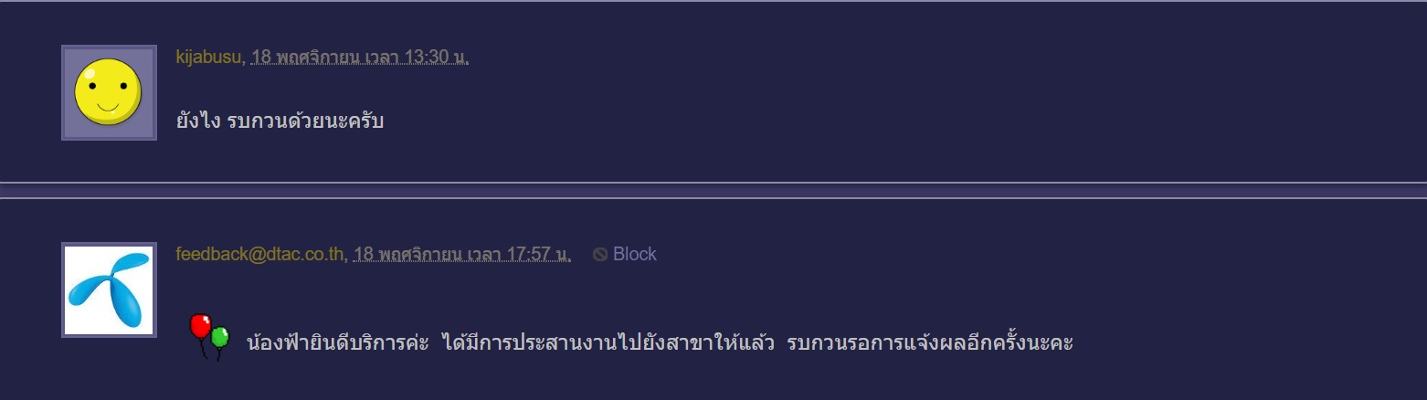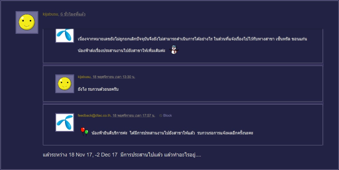 มี จนท. หลายคนมาตอบ แต่ไม่รู้ใครเป็นใคร ใครมาตอบ หรือตามเรื่องให้แต่แรก จะดีกว่านี้ อย่างค่ายสีเขียว สมายล์ -....(ชื่อ) อันนี้จะเห็น น้องฟ้า ,น้องใจดี