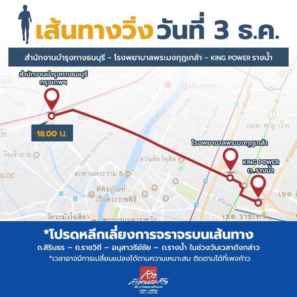 ทั้งนี้ จะใช้เส้นทางตั้งแต่ถนนบรมราชชนนี (ด้านล่าง) ตรงเข้าถนนสิรินธร-ข้ามสะพานซังฮี้-ถนนราชวิถี-โรงพยาบาลพระมงกุฎฯ-อนุสาวรีย์ชัยสมรภูมิ-วนเข้าถนนพญาไท-เข้าที่พักที่โรงแรมพูลแมนคิงพาวเวอร์ซอยรางน้ำ