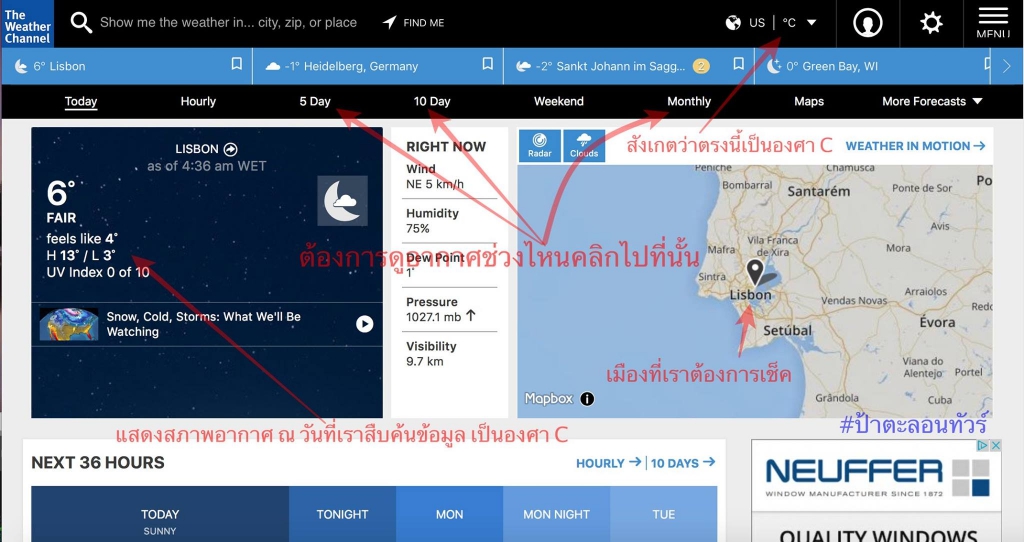 2. พิมพ์ชื่อเมืองที่ท่านจะไปในช่องที่เขามีให้เพื่อค้นหาข้อมูล เช่น ของผู้เขียนจะไป Lisbon, Portugal ในช่วงวันที่ 24-27 ธันวาคม ก็จะพิมพ์คำว่า Lisbon, Portugal ลงไป หรือเวลาเราพิมพ์คำว่า Lisbon ก็จะมีตัวเลือกขึ้นมาให้เราหลายตัวเลือก เราก็เลือกที่ Portugal เสร็จแล้วคลิก enter เวปจะสืบค้นข้อมูลให้เรา เป็นสภาพอากาศ ณ วันที่เราสืบค้น กรณีที่อยู่ประเทศไทยเคยชินกับการใช้องศา C เราก็ต้องเปลี่ยนเสียก่อน เวลาแสดงค่าอุณหภูมิเราจะได้ถึงบางอ้อได้ดีหน่อย ส่วนของผู้เขียนอยู่สหรัฐฯ เลยตั้งค่าเป็นองศา F แต่ภาพประกอบขั้นตอนที่ 3 นี้ก็เปลี่ยนให้เป็น C แล้วนะคะ