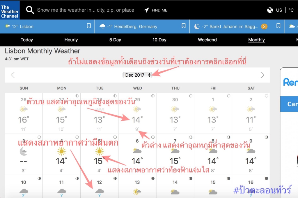 ก่อนการตะลอนทัวร์ทุกครั้ง ผู้เขียนจะสำรวจสภาพอากาศของเมืองที่จะไปเสมอ เช่น เดือนธันวาและมกรานี้จะไปตะลอนทัวร์ Portugal และ Spain ผู้เขียนจำเป็นต้องเช็คสภาพอากาศเป็นอย่างดี เพราะเข้าใจว่าประเทศเขาต้องหนาว แต่จะหนาวขนาดไหน นั้นยังไม่ค่อยแน่ใจดังนั้นจึงต้องเข้าไปเช็คจากเวปไซต์ที่เกี่ยวข้องดู เช่น weather.com ซึ่งเวปนี้ผู้เขียนจะใช้ประจำและไปกลับ เวปไซต์นี้ค่อนข้างให้ข้อมูลเกี่ยวกับสภาพอากาศในโซนต่าง ๆ เมืองต่าง ๆ ได้ดี มีข้อมูลเชิงพยากรณ์ 10 วัน และเป็นเดือนให้ด้วย นอกจากนั้นก็ยังสามารถเช็คดูข้อมูลย้อนหลังไปในปีที่ผ่านมาได้ด้วย ซึ่งก็ช่วยได้มาก เพราะถ้าเราจะไปเที่ยวที่ไหน ในช่วงเวลาเลยจาก 10 วันที่เขาทำพยากรณ์ให้เราก็สามารถเข้าไปดูสภาพอากาศหรืออุณหภูมิในปีที่ผ่านมาได้ ซึ่งเราก็พอจะเห็นเป็นประมาณการณ์ได้ว่าปีที่แล้วขนาดนี้ ปีนี้น่าจะประมาณสันฐานเดียวกัน