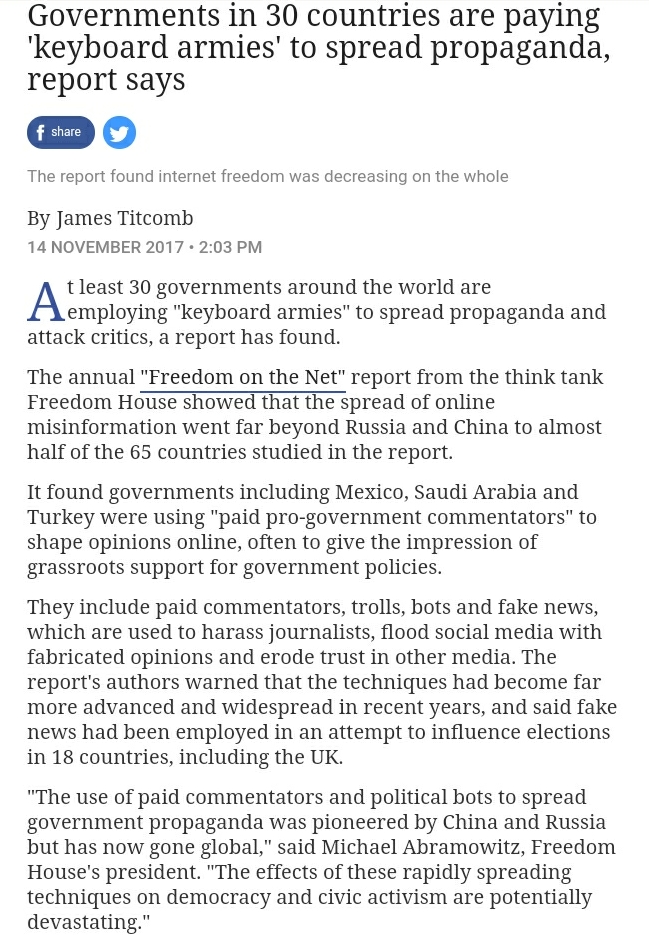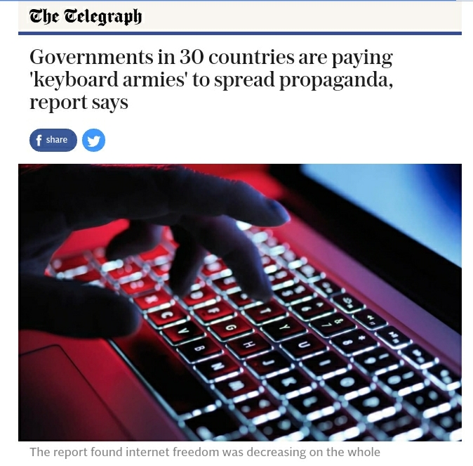 รายงานข่าวเขาบอกว่ามีรัฐบาลถึง 30 ประเทศใช้นักรบคีย์บอร์ดในการเผยแพร่โฆษณาชวนเชื่อ โดยมีจีนกับรัสเซียเป็นต้นแบบ ซึ่งมาในรูปแบบต่างๆ เช่น เป็นผู้แสดงความคิดเห็นที่รับจ้างมา เกรียน บอท ข่าวปลอม ฯลฯ