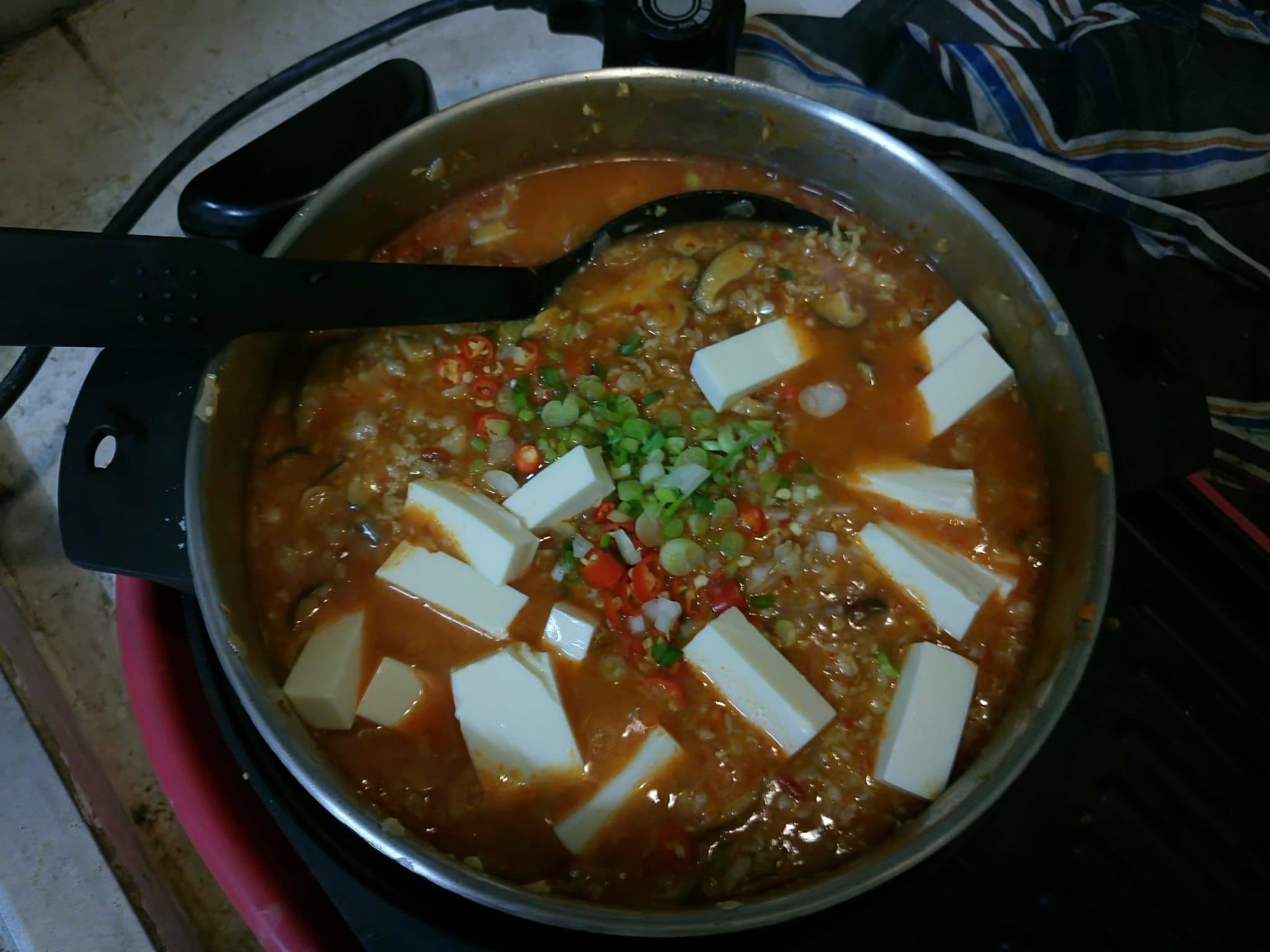 เมื่อข้นตามที่เราชอบแล้วก็ใส่ เต้าหู้ พริกซอย และต้นหอมซอย ก็เป็นอันเสร็จ