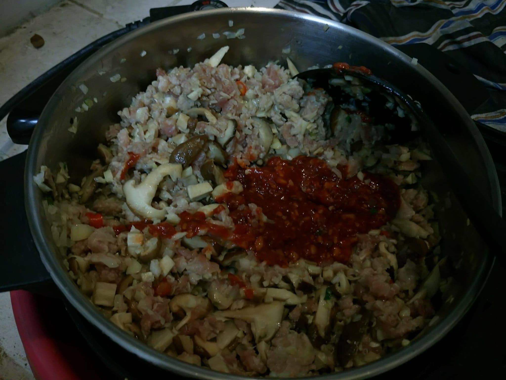 - พอเข้ากันดีใส่น้ำลงไป ปรุงรสด้วย น้ำตาล น้ำมันหอย เกลือเล็กน้อยเพราะซอสพริกกระเทียมมีความเค็มแล้ว