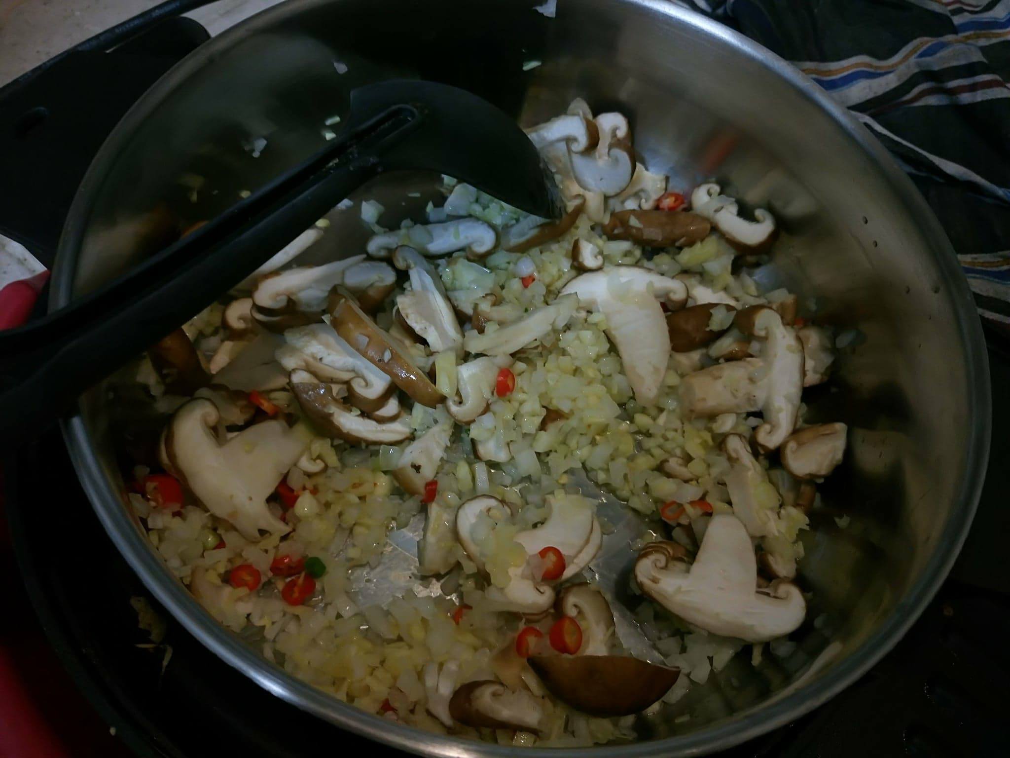 -ใส่น้ำมันเล็กน้อย พอร้อนใส่หอมใหญ่สับ และขิงสับลงไปผัด แล้วใส่เห็ดหอมที่เราหั่นไว้ลงไปผัด
