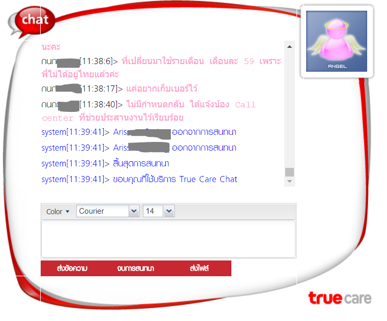 เริ่มคุยเวลา 10:39:39 เอ๊ะ! หรือระบบตัดทุกชั่วโมง ถ้าอย่างนั้นคุณพนักงานควรเตือนไหมคะว่าระบบจะตัด (ถึงกระนั้นเลยเราจะไม่เป็นนางฟ้ามาเป็นนางมารกันค่ะ)