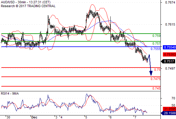 จุดที่ต้องการ: สถานะขายต่ำกว่า 0.7555 เป้าหมายต่อไปที่ 0.7500 และ 0.7475