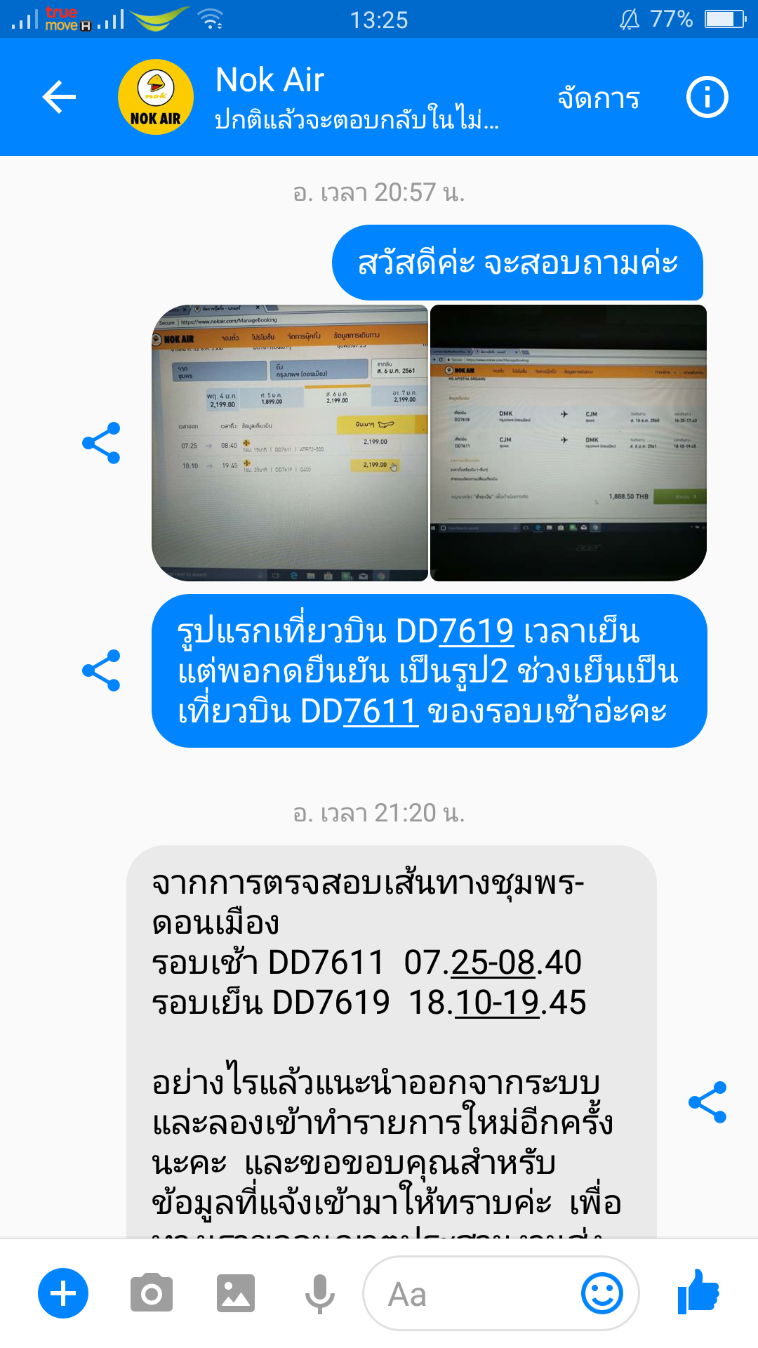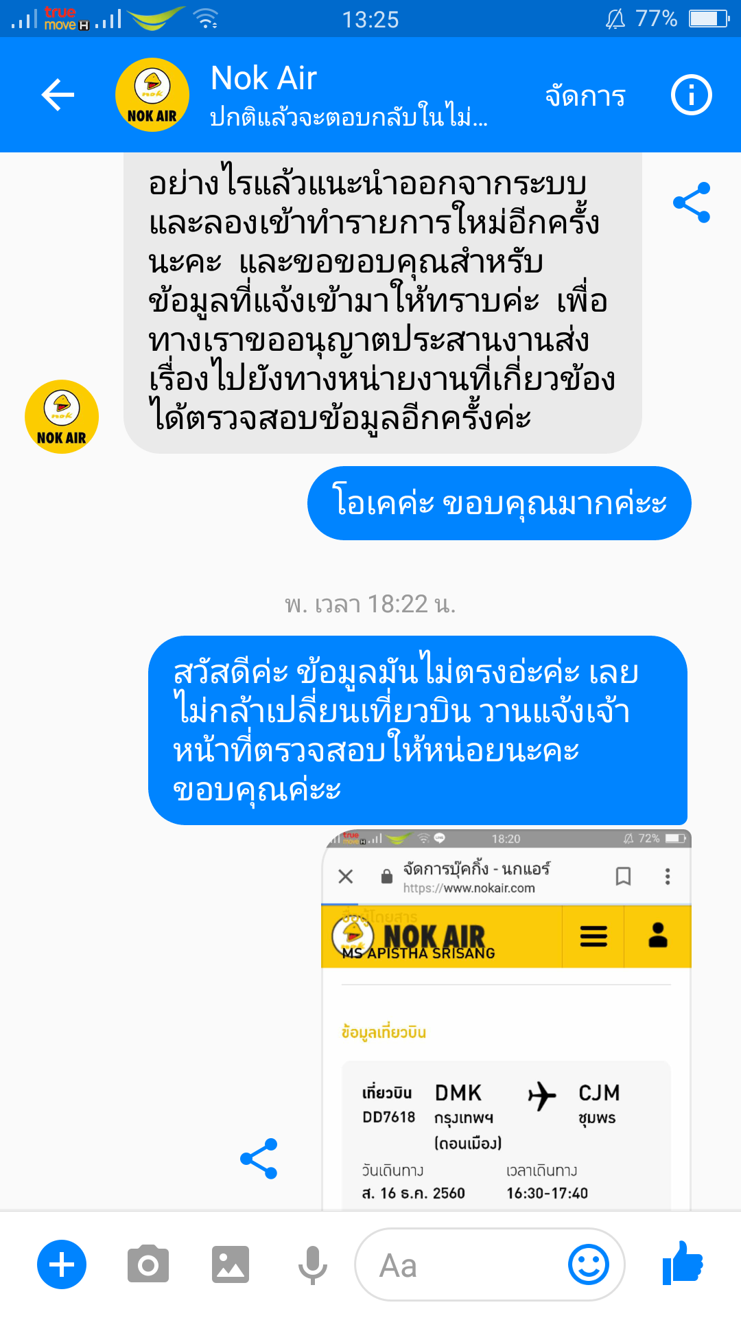 ดิฉันได้ทำการจองเที่ยวบินไปกลับดอนเมืองชุมพร และต้องการเปลี่ยนแปลงเที่ยวบินขากลับผ่านทางเว็บไซต์ของนกแอร์ แต่มีข้อมูลผิดพลาด คือเที่ยวบินไม่ตรงกับเวลาเครื่องออก ดิฉันได้ทักไปบอกแอดมินในเพจนกแอร์ทั้งหมด3ครั้ง 2ครั้งแรก ทางแอดมินบอกจะประสานไปทางหน่วยงานที่เกี่ยวข้อง ครั้งล่าสุดเมื่อวานอ่านแล้วแต่ไม่มีการตอบกลับ ดิฉันเพียงอยากรู้ว่า ได้ทำการแก้ไข หรือมีการติดต่อให้แก้ไขรึยังคะ ดิฉันไม่ทราบว่าระยะเวลาการดำเนินการตรงส่วนนี้ต้องใช้เวลานานเเค่ไหน ดิฉันไม่คิดว่าจะนานถึง3วัน (วันนี้ก็ยังคงเป็นเหมือนเดิมค่ะ) ดิฉันแค่ต้องการความแน่ใจว่าดิฉันจะลงเที่ยวบินและเวลาถูก