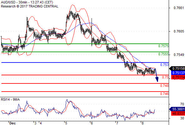 จุดที่ต้องการ: สถานะขายต่ำกว่า 0.7530 เป้าหมายต่อไปที่ 0.7500 และ 0.7480