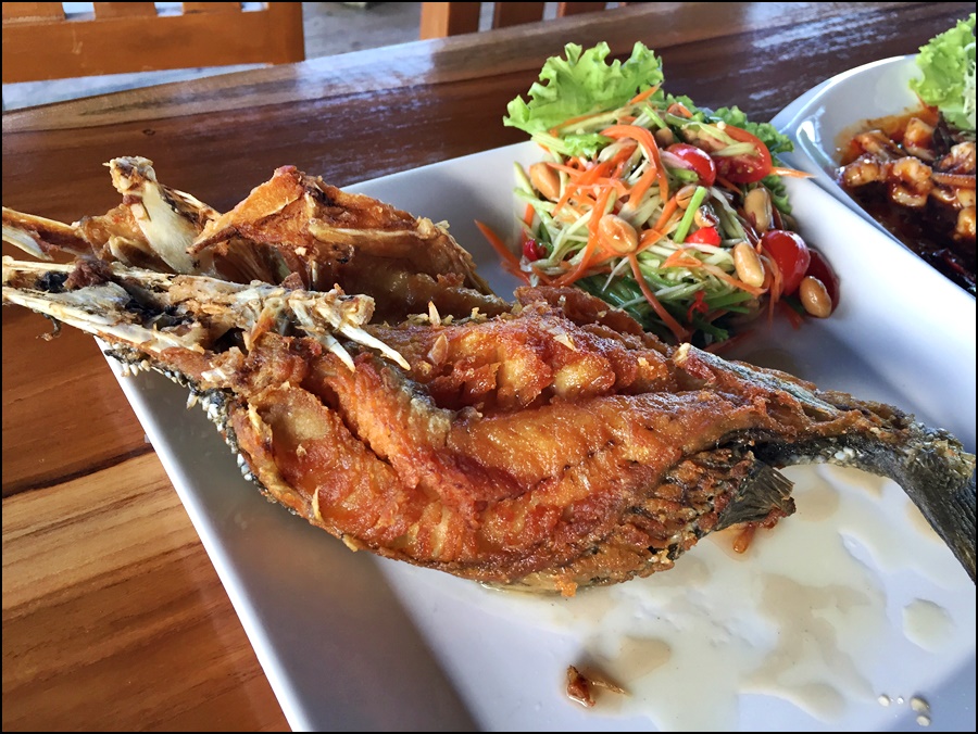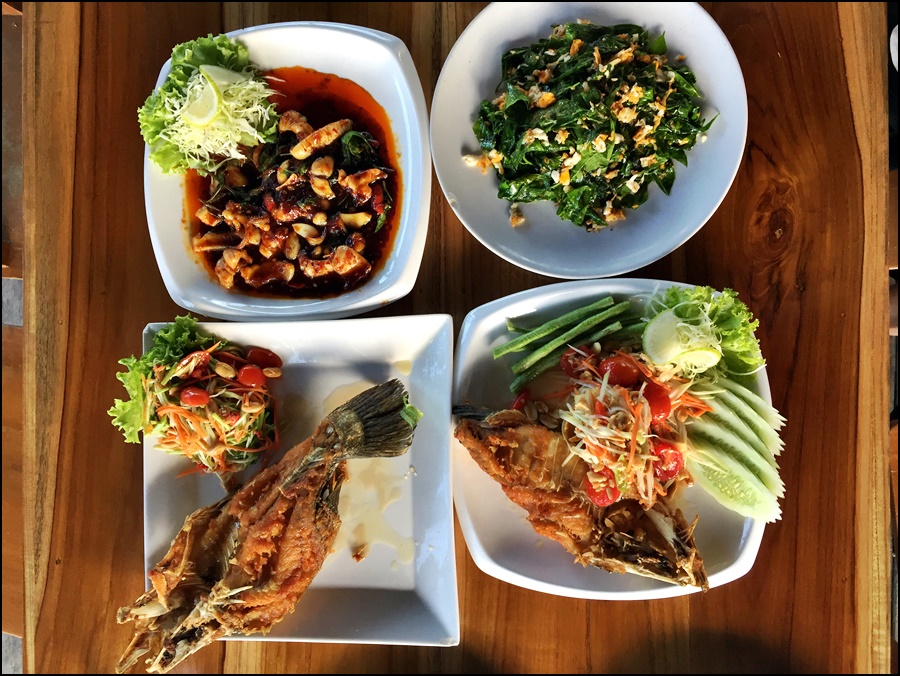 เมนูที่สั่งก็จะมีปลากะพงทอดน้ำปลา ส้มตำปลากะพง ปลาหมึกผัดพริกเผา ใบเหลียงผัดไข่ สั่งกันอย่างละสองเมนู ก่อนจะได้พบว่า....