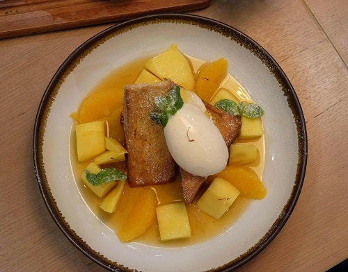 โทสอบมากำลังดี กรอบนอกนุ่มใน ท็อปด้วยไอศกรีมวานิลลา ส้มและมะม่วงสุก ราดซอสมะม่วงมาอีกที