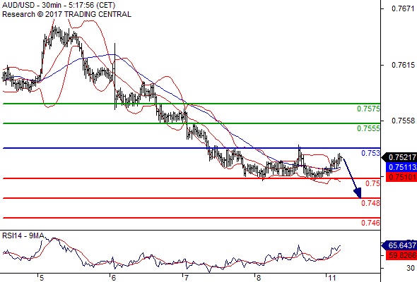 จุดที่ต้องการ: สถานะขายต่ำกว่า 0.7530 เป้าหมายต่อไปที่ 0.7500 และ 0.7480