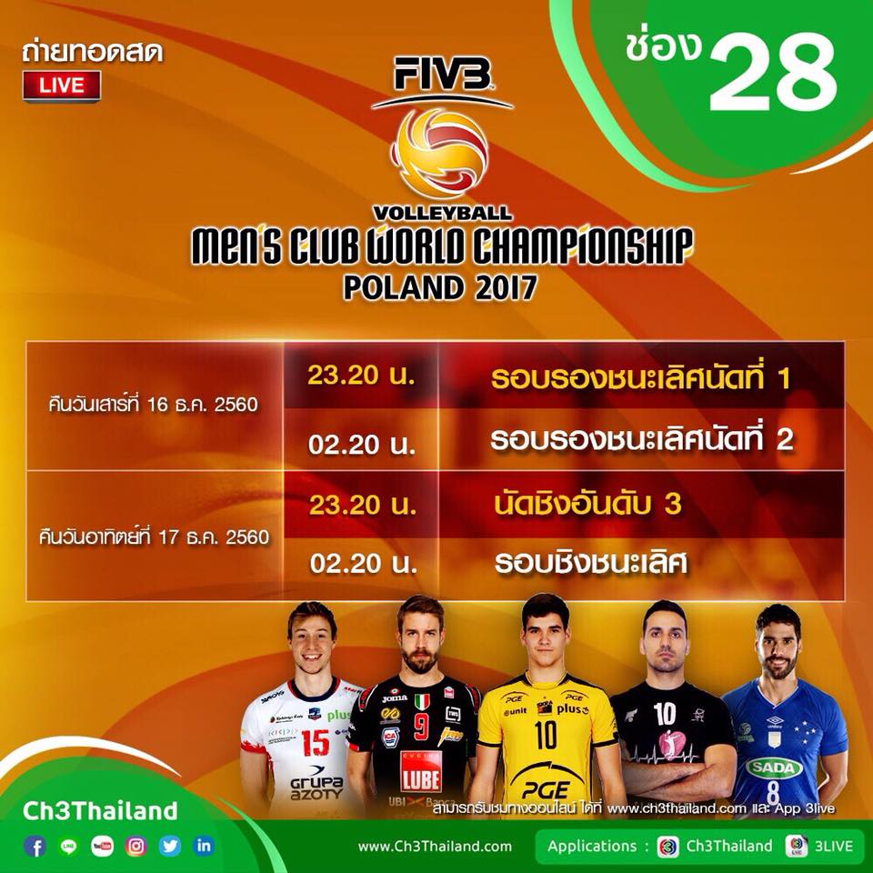 เอาโปรแกรมถ่ายทอดสดวอลเลย์ชายชิงแชมป์สโมสรโลกมาแชร์ครับ