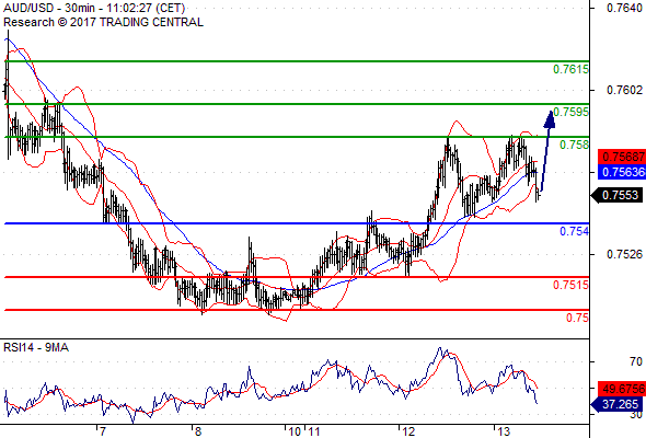 จุดที่ต้องการ: สถานะซื้อสูงกว่า 0.7540 เป้าหมายต่อไปที่ 0.7580 และ 0.7595
