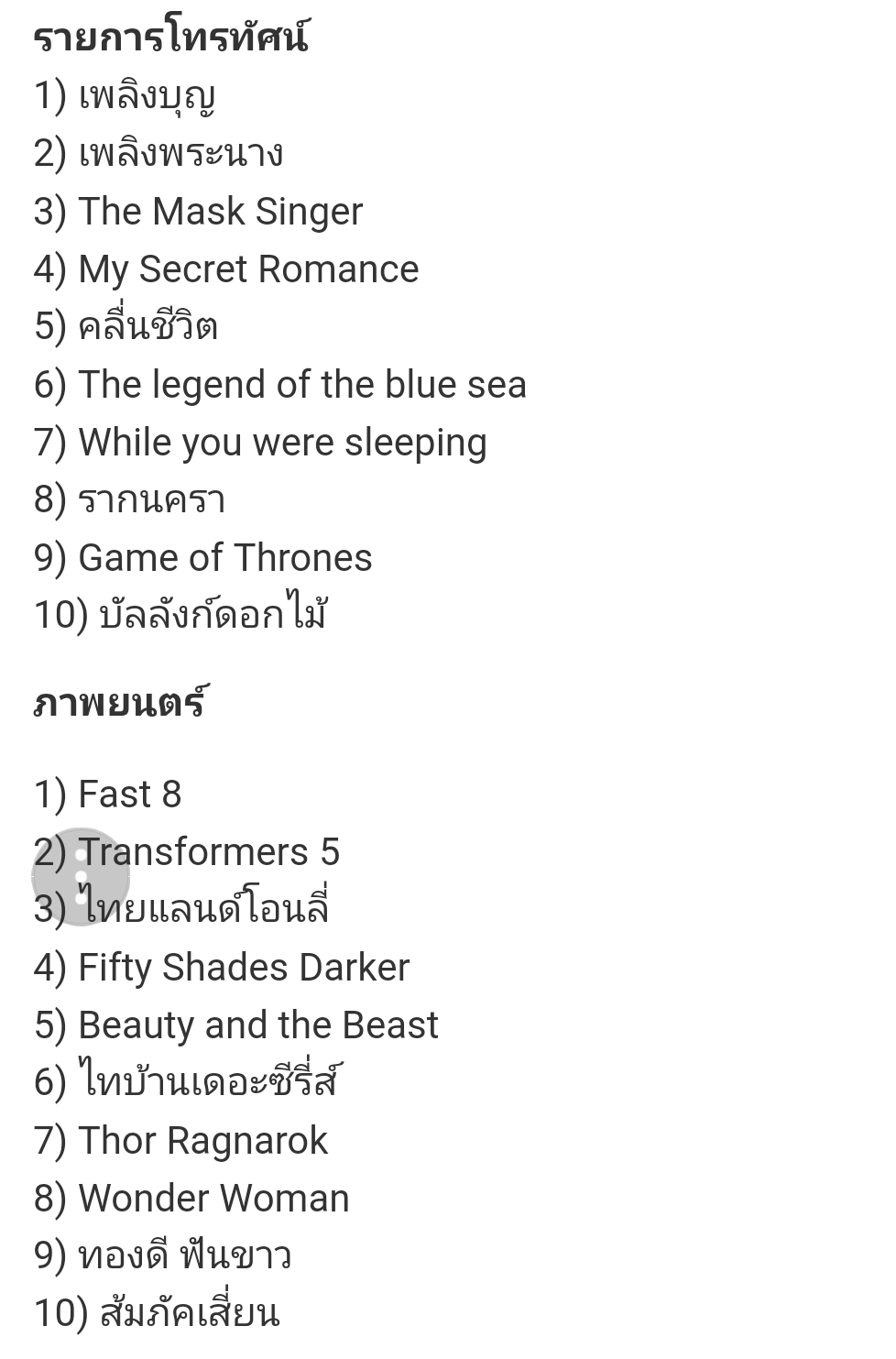 ช่องวัน 1.ราชินีหมอลำ 2.เธอคือพรหมลิขิต ช่อง3 1.เพลิงบุญ 2.คลื่นชีวิต ช่อง7 1.เพลิงพระนาง 3.นายฮ้อยทมิฬ