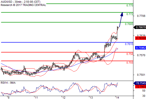 AUD/USD การซื้อขายระหว่างวัน: มุ่งไปที่ 0.7685