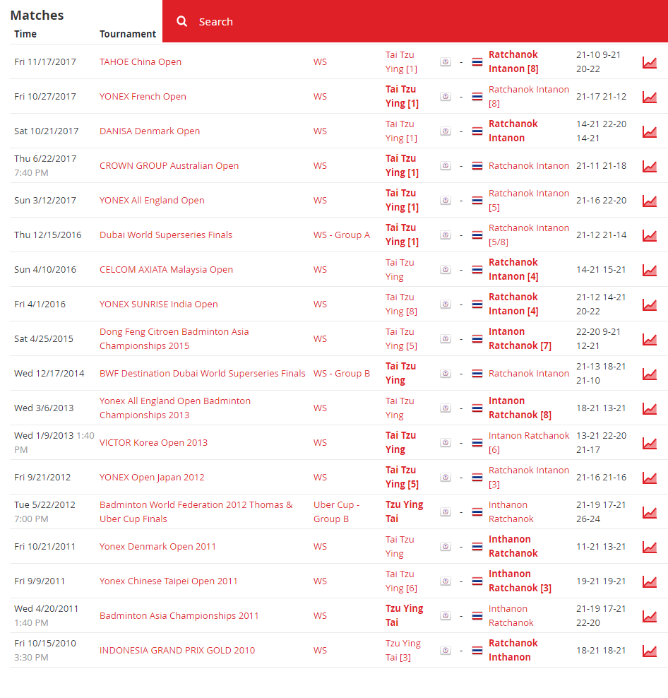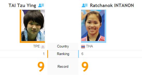 ทั้งสองคนเคยพบกันมาทั้งหมด 18 ครั้ง น้องเมย์ รัชนก อินทนนท์ชนะ 9 ครั้ง ไท่ ซื่อหยิง ชนะ 9 ครั้ง การพบกันล่าสุดรายการ ไชน่า โอเพ่น 2017 น้องเมย์ เอาชนะ ไท่ ซื่อหยิง ไปได้ 2-1 เกม 10-21, 21-9, 22-20