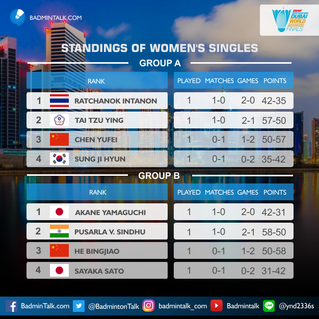 นัดแรก น้องเมย์ เอาชนะ ซุง จีฮุน 2-0 เกม 21-19, 21-16 ไท่ ซื่อหยิง ชนะ เฉิน หยูเฟ่ย 2-1 เกม 15-21, 21-12, 21-17