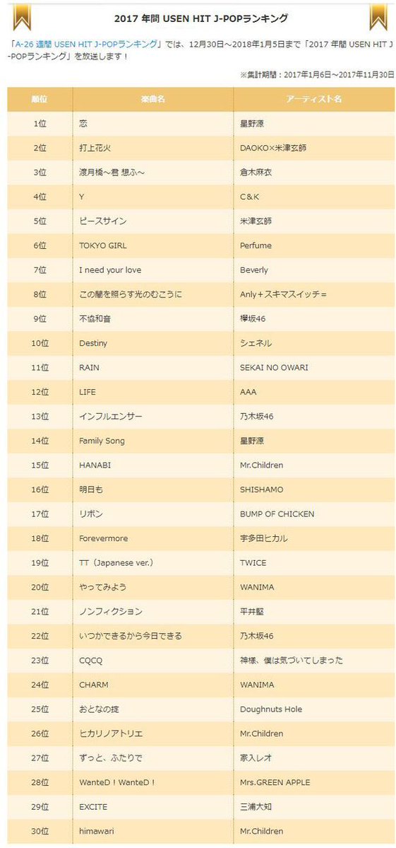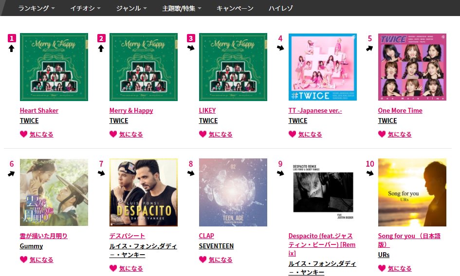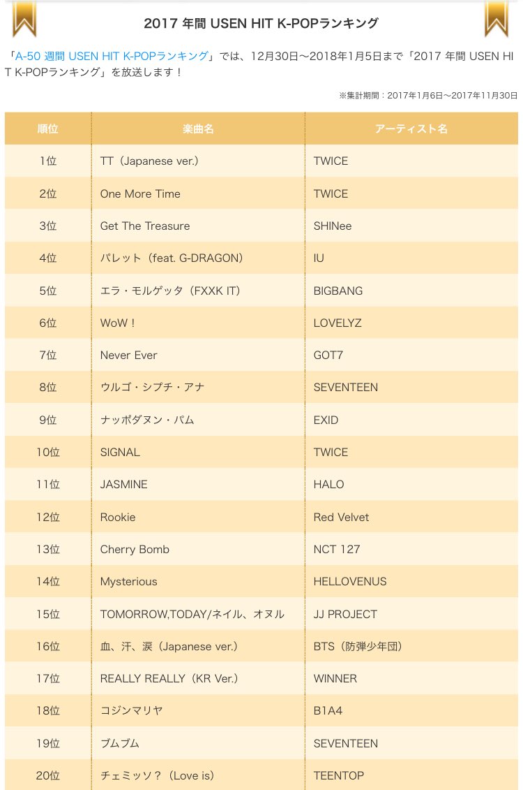 Music USEN ประกาศอันดับเพลงฮิตในปี2017 โดยหมวด K-POP โดย TWICE ติดไป3เพลงรวด