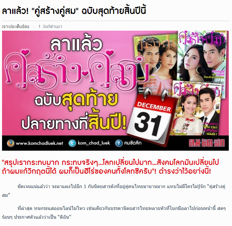 ทยอยประกาศปิดตัวลงอย่างต่อเนื่องและอย่างน่าเสียดาย ล่าสุดก็เป็นคิวของ "นิตยสารคู่สร้างคู่สม"
