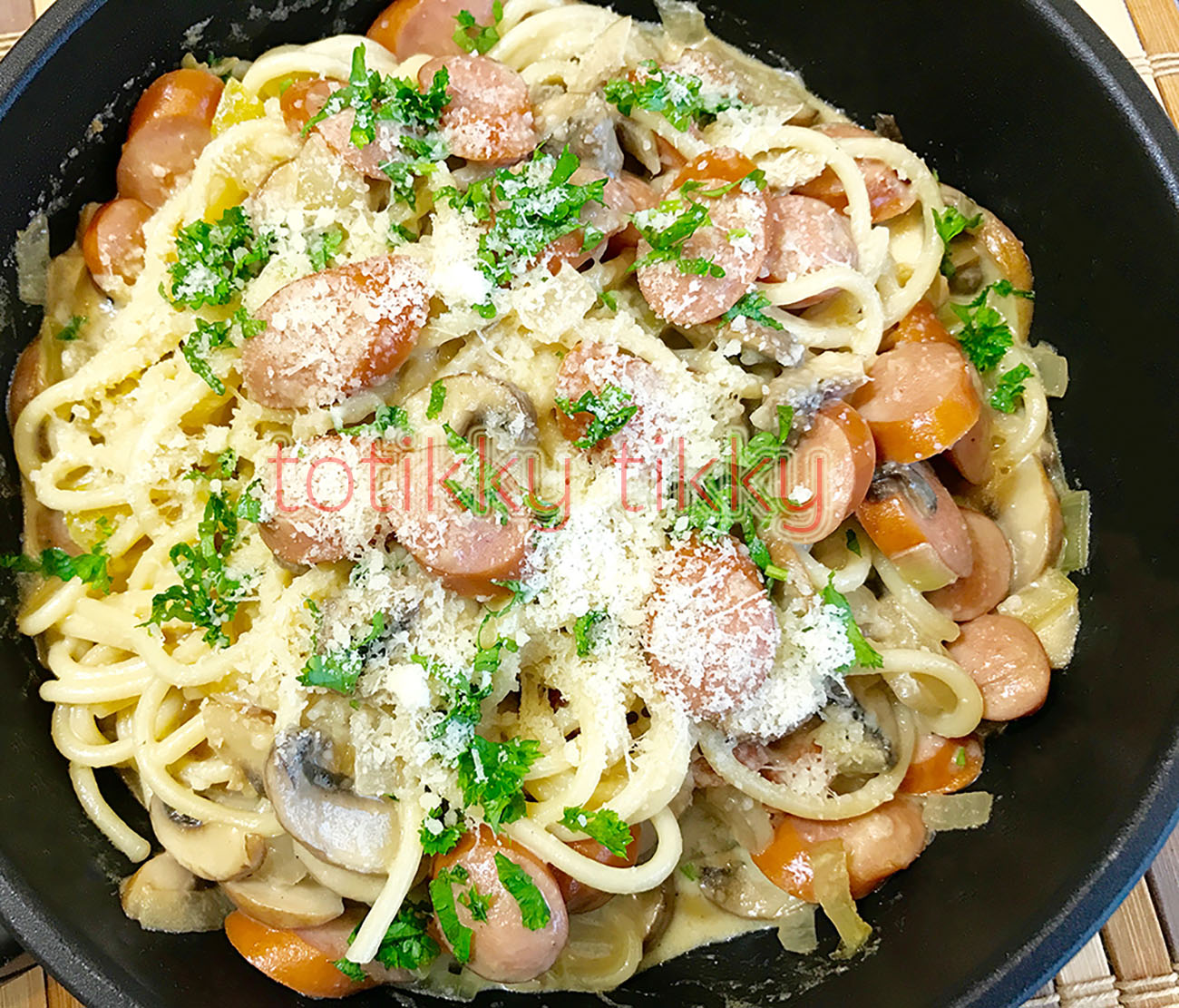 ครีมมี่ไส้กรอกและเห็ดสปาเก็ตตี้